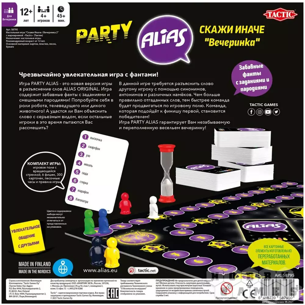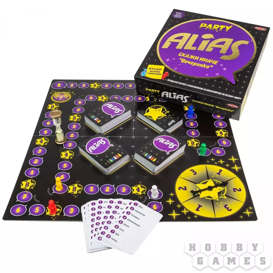 Данный вариант адаптирован для вечеринок и тусовок. В этой игре, так же как и в прочих играх серии, необходимо при помощи подсказок изобразить необходимое слово товарищу по команде (подсказки – слова-синонимы и другое). В отличие от прочих игр серии, в Alias Party придётся объясняться новыми, необычными и невероятными способами, если фишка команды попадает в поле Party ("Вечеринка"). Тут будьте готовы, что придется не только объяснять слова а, к примеру, рассказать анекдот, в котором есть слова из карточки, объяснить слово вприпрыжку либо в необычной позе. Также может выпасть задание объяснять слова в разных эмоциональных состояниях – счастливом, злом, истерическом. Эта игра выявит способности каждого объяснить, призовет к креативности и активности.