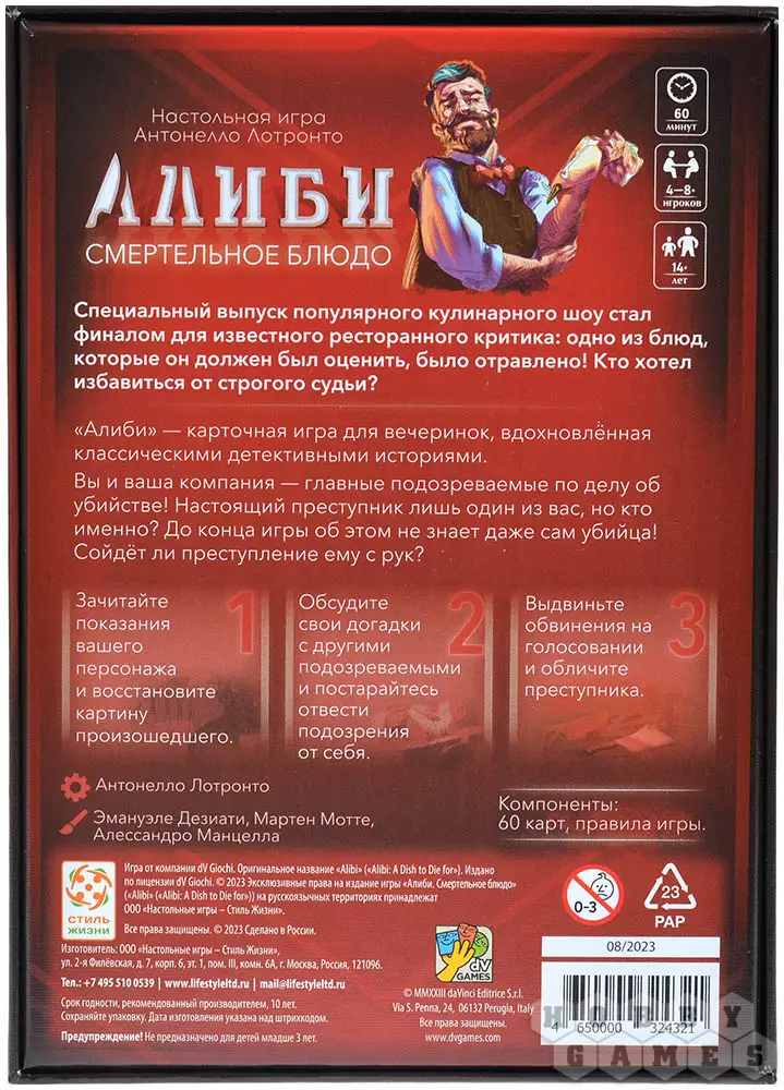 Серия игр "Алиби" предлагает вам окунуться в мир интриг и загадок, где каждый из игроков становится главным подозреваемым в убийстве. Но кто настоящий преступник неизвестно даже самому убийце, пока не откроются последние карточки колоды...