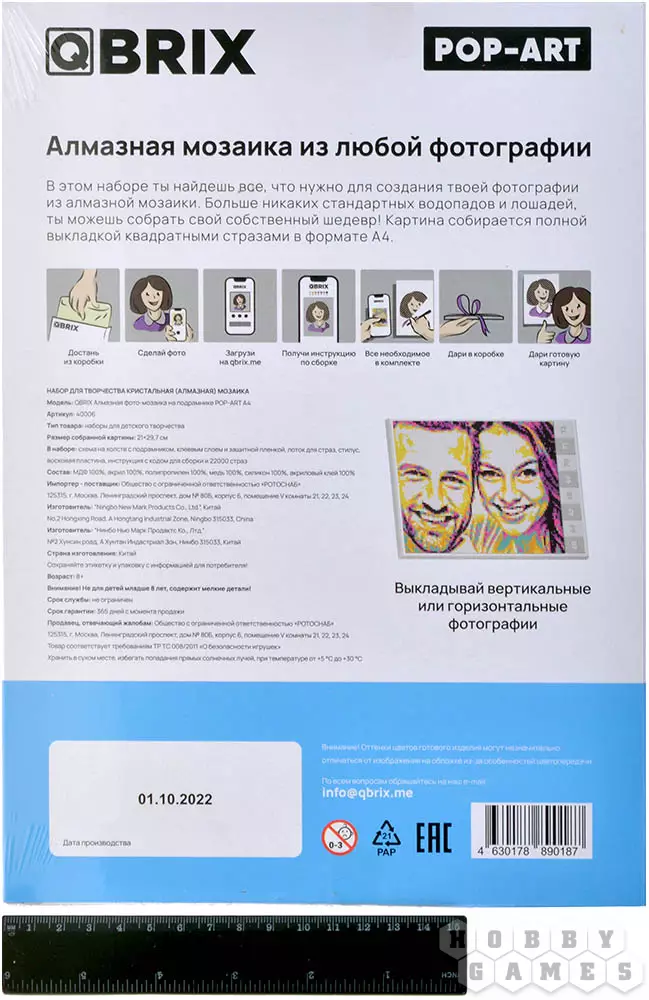 Перед вами мозаика нового поколения, которая позволит превратить любую фотографию в картину в стиле пиксель-арт. Готовую картину можно повесить (крепление идёт в комплекте) или поместить в рамку, подходит любая стандартная А4. Собирать можно с телефона в удобном генераторе, отмечая все заполненные участки.