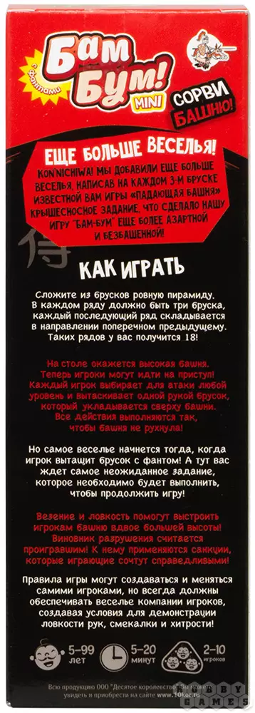 В данной версии на деревянных брусках вы найдёте особые задания, которые нужно будет незамедлительно выполнить, если из башни достаётся такой брусок. Например, вам потребуется продемонстрировать свой поэтический дар, сочинив любое стихотворение, или же изобразить пчёлку, добывающую нектар. Словом, скучно не будет! К тому же, всегда можно подключить фантазию и придумать новые увлекательные задания, написав их прямо на брусках. Или же можно пронумеровать бруски, а фанты выписать в отдельный блокнот. Творите, придумывайте, развлекайтесь и весело проводите время вместе с настольной игрой "Бам-Бум"!