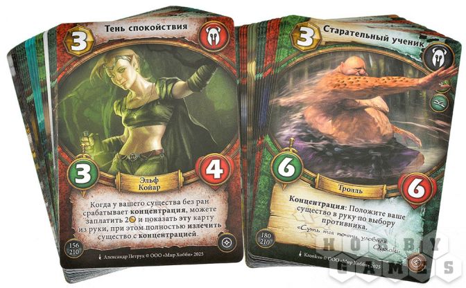 Весь игровой процесс, как вы уже поняли, строится на картах. В своей колоде вы должны иметь одну карту героя, которая является вашим альтер эго в игре, обладает определённым запасом жизни, способностью и стихией. Всего стихий пять: степи, горы, лес, болота, тьма. Карты без стихии – нейтральные. Помимо карты героя, в колоде вы можете иметь от 40 карт той стихии, к которой принадлежит ваш герой, но не более трёх копий одной и той же карты.