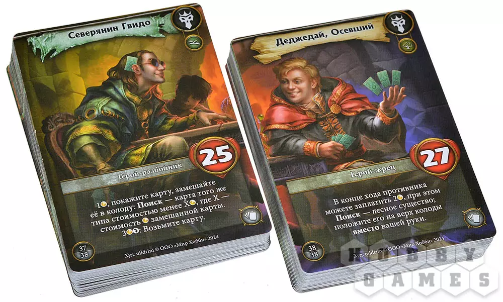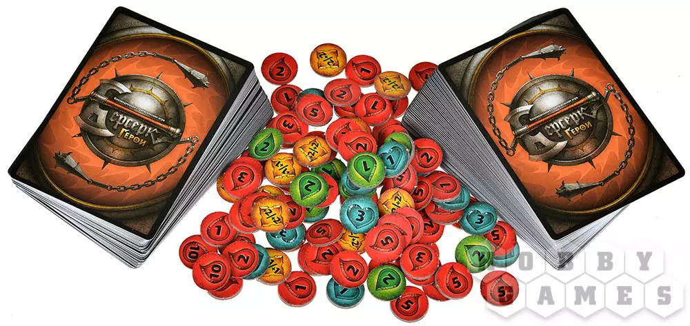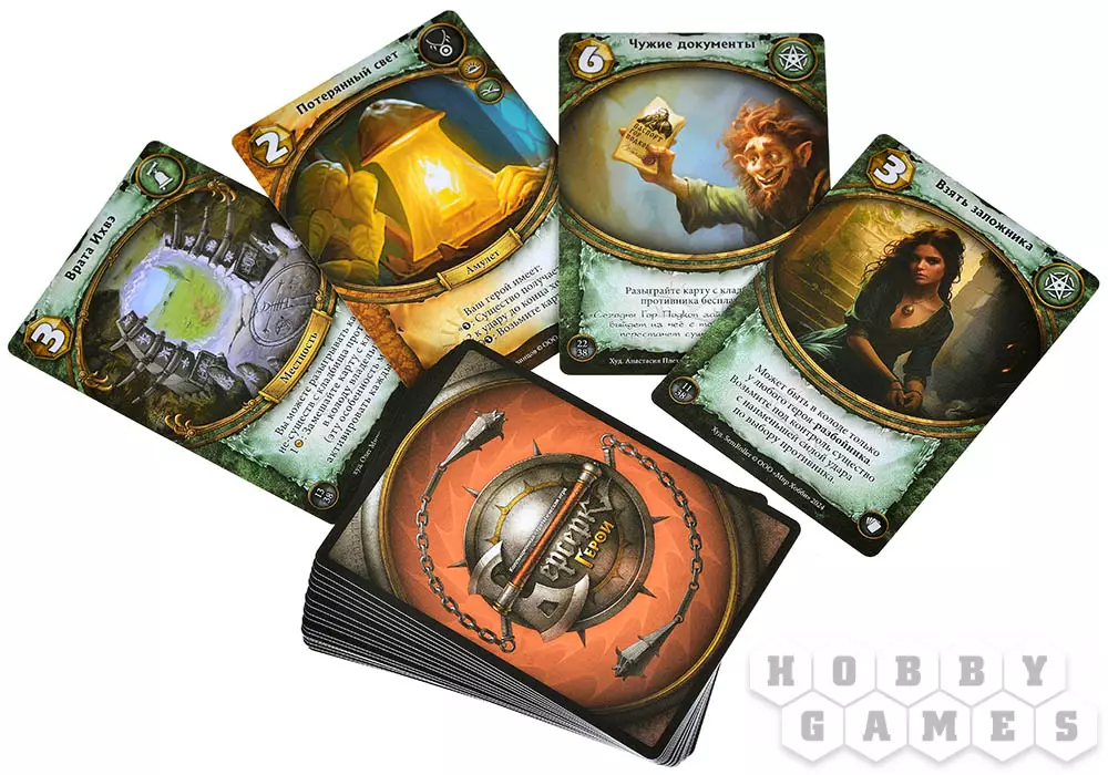Весь игровой процесс, как вы уже поняли, строится на картах. В своей колоде Вы должны иметь одну карту героя, которая является Вашим альтер эго в игре, обладает определённым запасом жизни, способностью и стихией. Всего стихий пять: степи, горы, лес, болота, тьма. Карты без стихии – нейтральные. Помимо карты героя, в колоде Вы можете иметь от 40 карт той стихии, к которой принадлежит Ваш герой, но не более трёх копий одной и той же карты.