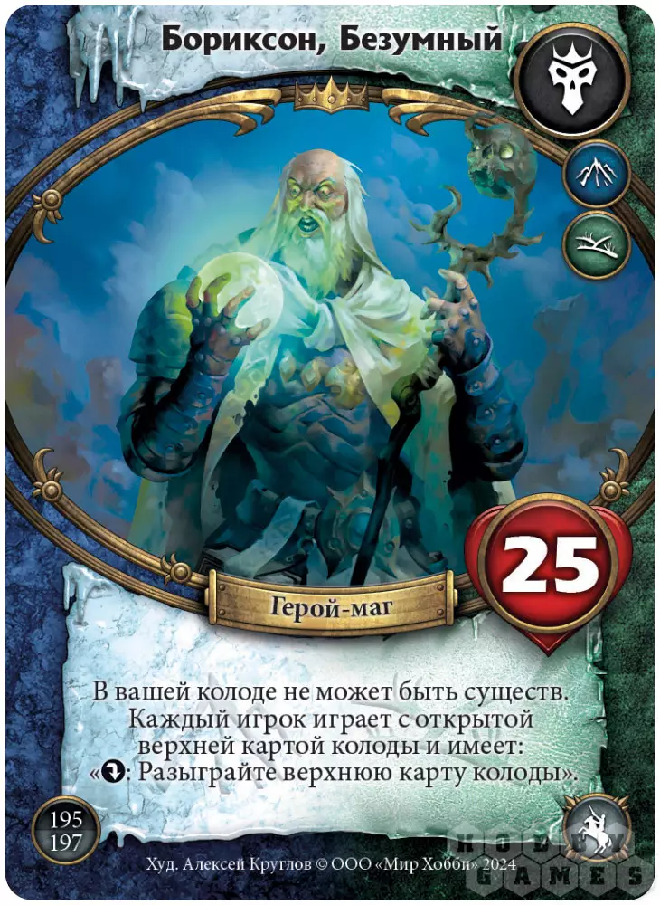 Весь игровой процесс, как вы уже поняли, строится на картах. В своей колоде Вы должны иметь одну карту героя, которая является Вашим альтер эго в игре, обладает определённым запасом жизни, способностью и стихией. Всего стихий пять: степи, горы, лес, болота, тьма. Карты без стихии – нейтральные. Обычно помимо карты героя, в колоде Вы можете иметь от 40 карт той стихии, к которой принадлежит Ваш герой, но не более трёх копий одной и той же карты. В формате Генерал ограничения на сбор колоды другие – в вашей колоде должно быть 60 неповторяющихся карт (кроме карт с Ордой, их по-прежнему может быть до 5 копий).