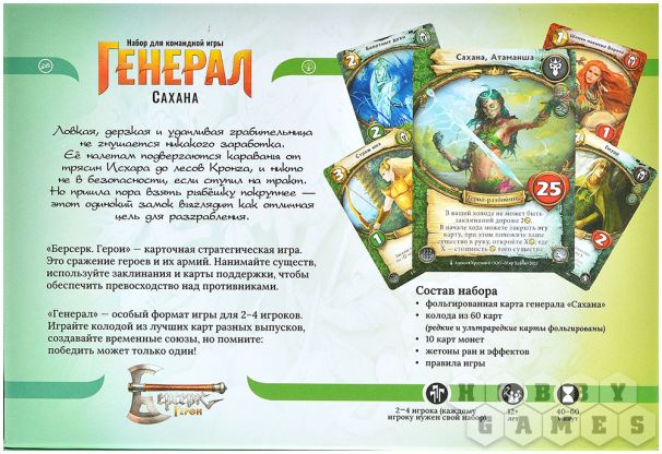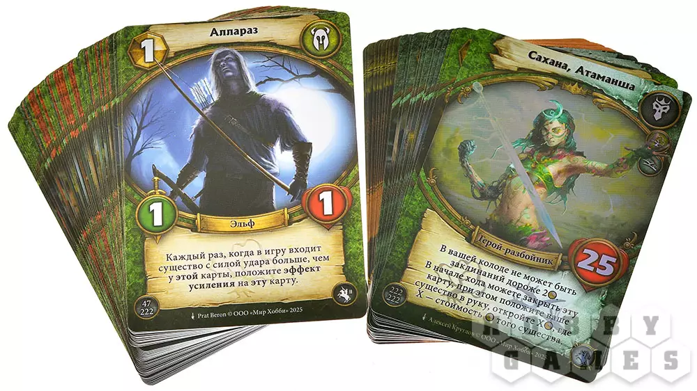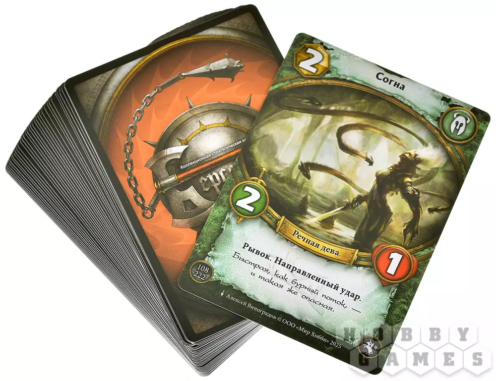 Весь игровой процесс, как вы уже поняли, строится на картах. В своей колоде Вы должны иметь одну карту героя, которая является Вашим альтер эго в игре, обладает определённым запасом жизни, способностью и стихией. Всего стихий пять: степи, горы, лес, болота, тьма. Карты без стихии – нейтральные. Обычно помимо карты героя, в колоде Вы можете иметь от 40 карт той стихии, к которой принадлежит Ваш герой, но не более трёх копий одной и той же карты. В формате Генерал ограничения на сбор колоды другие – в вашей колоде должно быть 60 неповторяющихся карт (кроме карт с Ордой, их по-прежнему может быть до 5 копий).