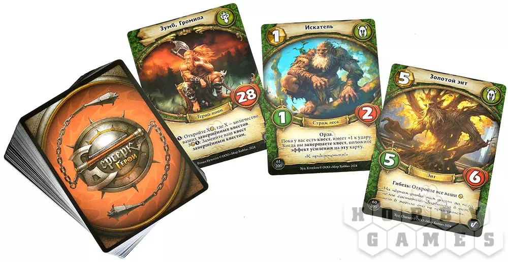 Весь игровой процесс, как вы уже поняли, строится на картах. В своей колоде вы должны иметь одну карту героя, которая является Вашим альтер эго в игре, обладает определённым запасом жизни, способностью и стихией. Всего стихий пять: степи, горы, лес, болота, тьма. Карты без стихии – нейтральные. Помимо карты героя, в колоде вы можете иметь от 40 карт той стихии, к которой принадлежит Ваш герой, но не более трёх копий одной и той же карты.