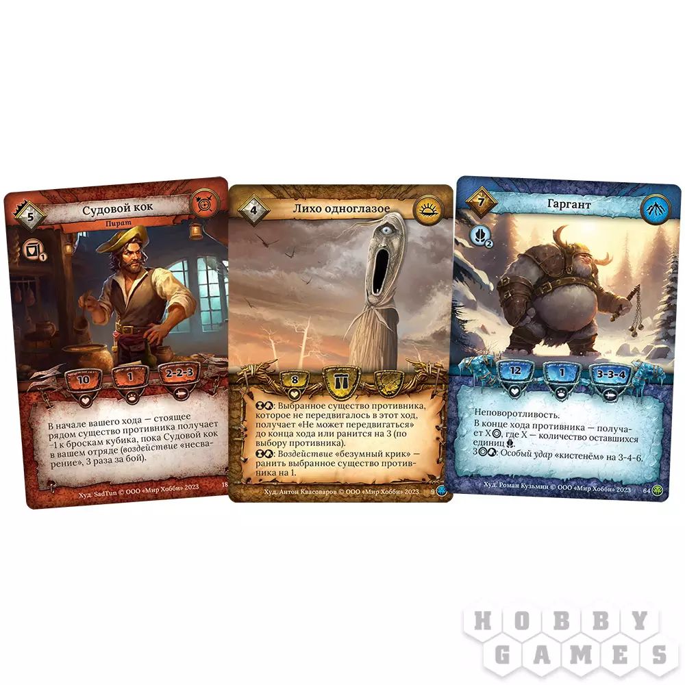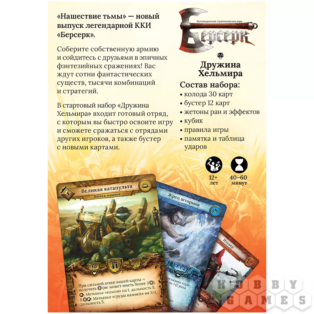 Стартовый набор содержит всё необходимое, чтобы быстро войти в игру, будь вы фанатом классики или новичком в мире "Берсерка"! Внутри вы найдёте готовую колоду "Дружина Хельмира" из 30 карт и бустер с 12 картами: более чем достаточно, чтобы вступить в бой полностью подготовленным! Обратите внимание, что этот набор расчитан на одного игрока. Для игры вдвоём вам потребуется два таких набора.