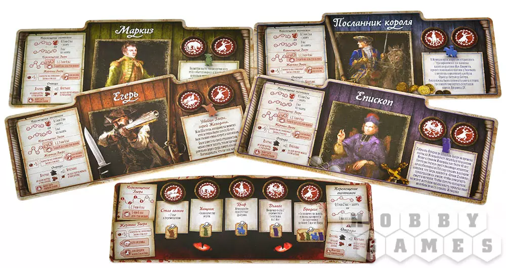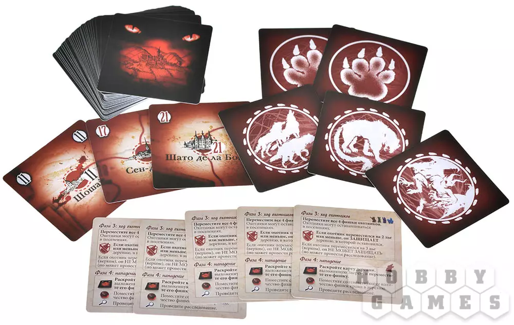 И в конце раунда происходит нападение. Игрок за Зверя открывает выбранную ранее карту деревни и перемещает туда свою фишку. Если там нет охотников, Зверь настигает своих жертв. Их количество рассчитывается по формуле: 5 - количество пройденных лье. Таким образом, чем меньше Зверь пройдёт от одной деревни к другой, тем больше новых жертв появится.