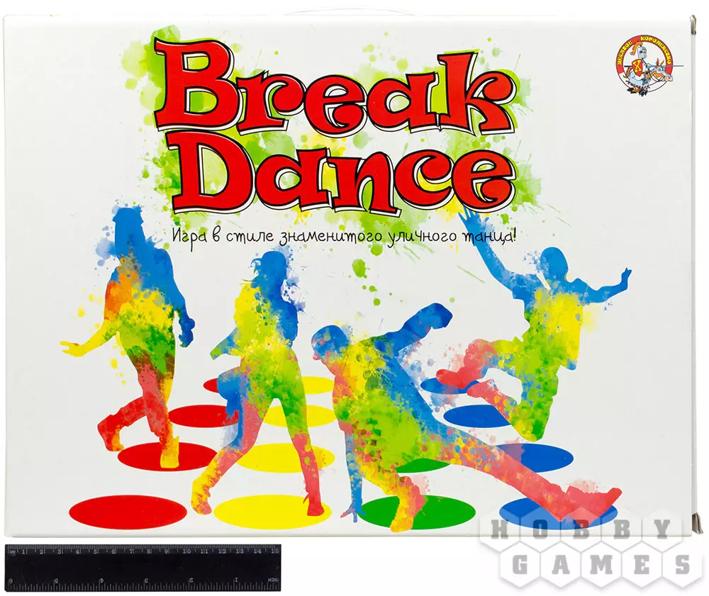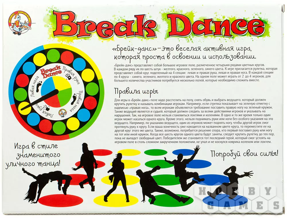 Брейк-данс – зрелищный уличный танец, который объединяет в себе элементы акробатики и хип-хопа. В настольной игре Break Dance вся ваша дружная компания окажется на танцполе и поборется за звание самого гибкого и выносливого танцора! Для игры вам потребуется немного свободного пространства, хорошее настроение и позитивный настрой.
