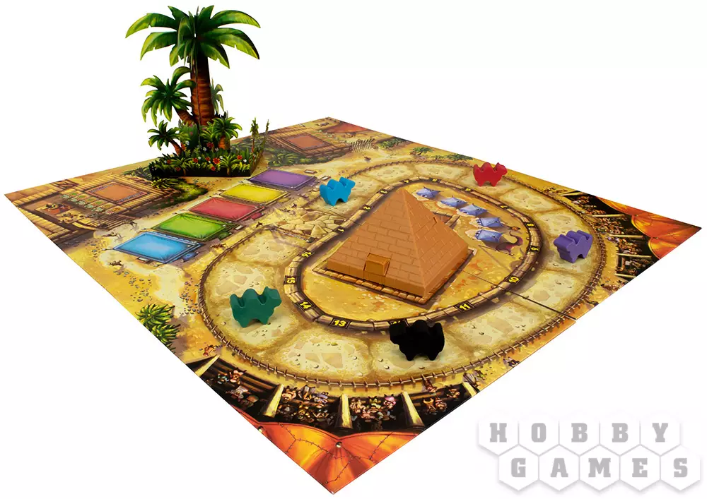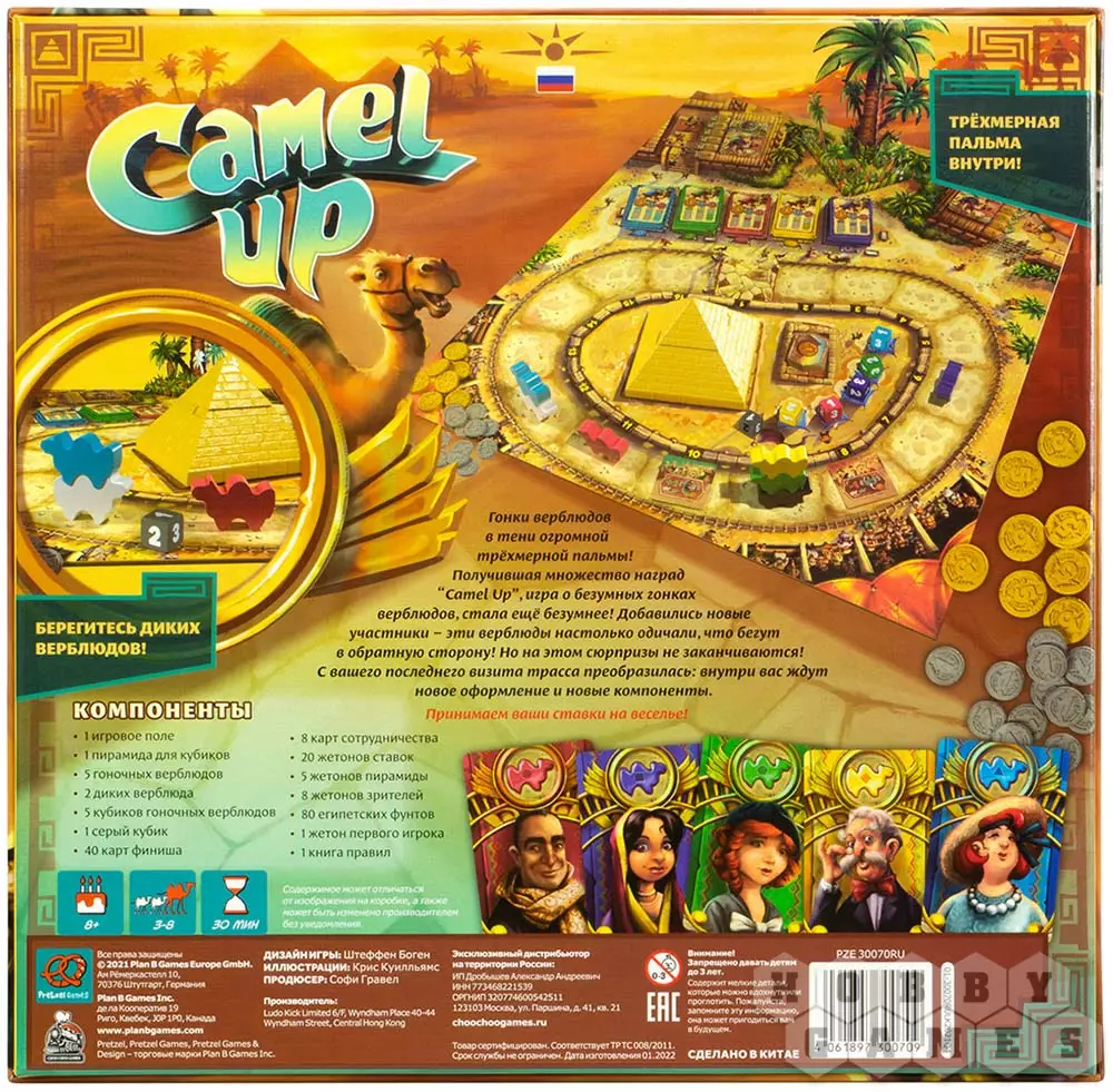 Настольная игра Camel Up – это весёлая, безумная и полная сюрпризов гонка! Игроки выступают в качестве зрителей на забеге верблюдов, в ходе которой им предстоит делать всё новые и новые ставки в зависимости от ситуации на поле. Безусловно, можно сделать один единственный выбор в пользу любимчика и до последнего за него топить. Но так ли вы удачливы? Все игроки, начиная с первого, по очереди могут выполнить одно из четырёх доступных действий: