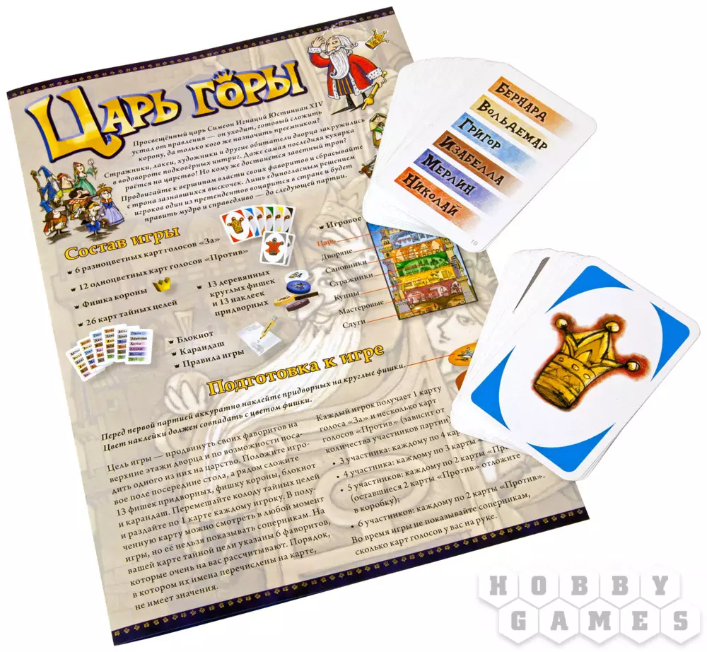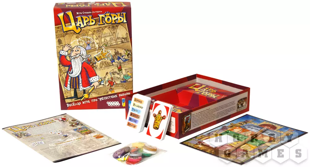 Великий Царь Симеон Игнаций Юстиниан XIV собрался уйти на покой, а правление отдать некому... Тут-то и разгораются нешуточные придворные страсти. Все, начиная от поварят и заканчивая художниками, хотят попытать свою удачу и оказаться на троне. И только Вы можете разрешить спор, разгоревшийся в настольной игре "Царь Горы". Продвигайте своих фаворитов всё выше и выше, не вызывайте подозрения у соперников, выводите своих людей на высокие посты... И пусть победит сильнейший!
