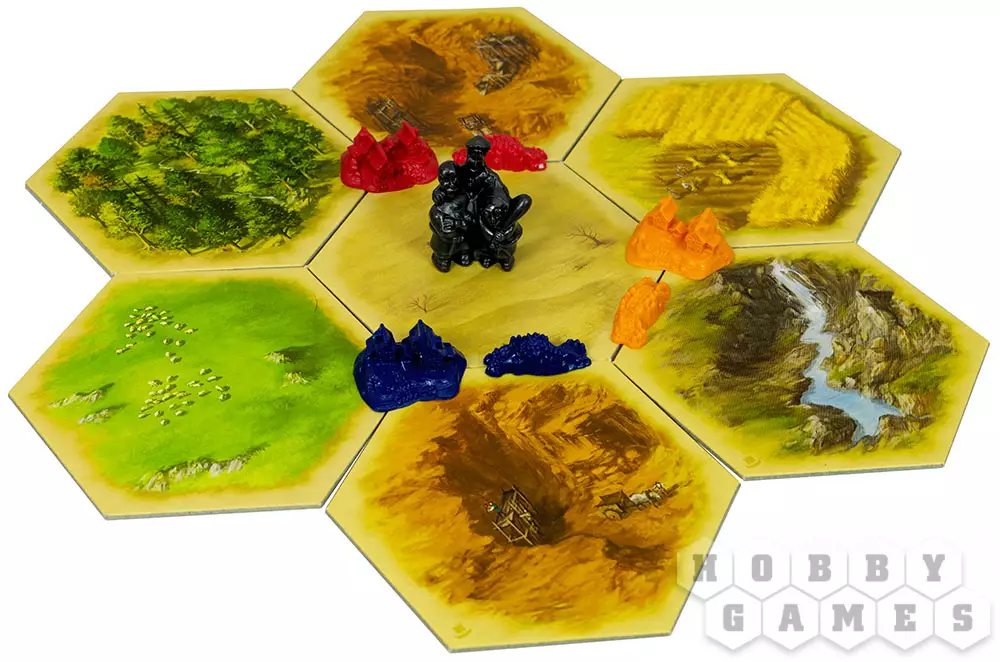 Игроки начинают с двумя дорогами и двумя поселениями, а выбор их местоположения принадлежит игроку. Таким образом, вы начинаете с 2 победными очками (ПО), цель же игры проста – набрать 10. Помните, что Города (2 ПО) возникают там, где уже есть Поселения (1 ПО), а Поселения можно построить только на Дороге. На любое строительство тратятся ресурсы, которых всегда не хватает. Тут вас может выручить торговля – обмен ресурсами это жизненная необходимость, ведь вы будете получать только сырьё определённых видов, с тех земель, где находятся ваши поселения и города. А гекс, где стоит Разбойник – вообще не приносит ресурсов... Чуть подробнее:
