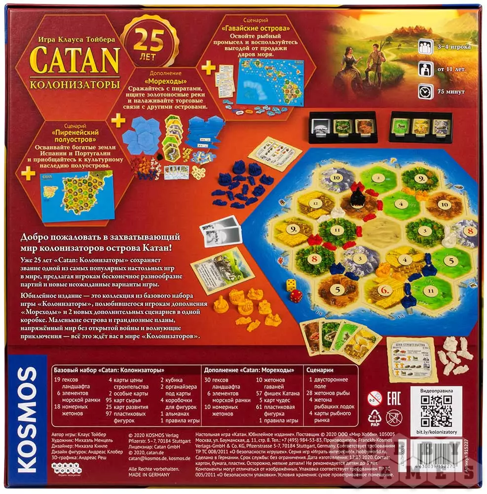Набор "Catan. Юбилейное издание" позволит вам сначала освоить основные правила базовой игры, попробовать себя в роли отважных мореплавателей с дополнением "Мореходы", а затем отправиться и к более далёким берегам в сценариях "Пиренейский полуостров" и "Гавайские острова".