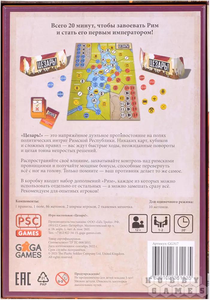 Несмотря на название игры, ответ неоднозначен – ведь в этой дуэльной стратегии один из игроков возьмёт роль Гая Цезаря, а другой – Гнея Помпея. Игра "Цезарь!" посвящена политическому и военному противостоянию, но отличается простыми правилами и динамичными ходами – что постоянно побуждает игроков принимать важные решения. Каждый ход ситуация на поле может измениться, а потому нельзя терять бдительность! По очереди игроки выкладывают жетоны влияния на границы регионов – тот, кто обладает в отдельно взятой провинции наибольшим влиянием, кладёт туда свой жетон контроля. Победить в игре можно двумя способами – либо выложив все свои жетоны контроля, либо загнать оппонента в ситуацию, где он не может разместить жетон влияния. В таком случае вы выигрываете и становитесь, вероятно, первым диктатором Рима – к добру это или нет!
