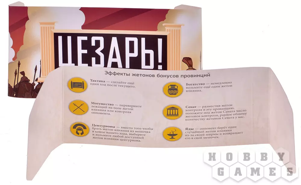 Также в комплект включены правила и компоненты для одиночной игры и ряд дополнений – "Яды", что позволяют устранять войска противника, и "Центурионы", что расширяют тактические возможности.