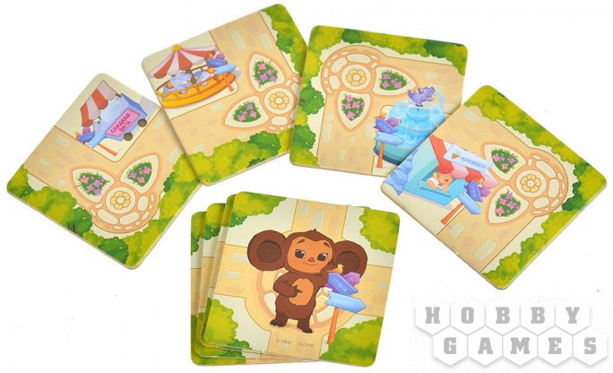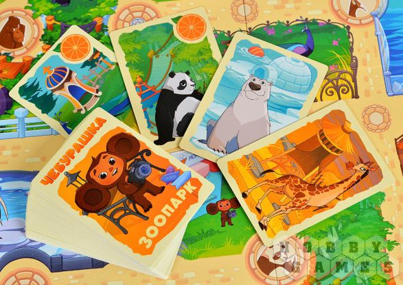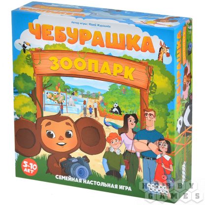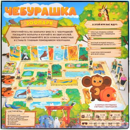 "Чебурашка: Зоопарк" – лёгкая и динамичная игра-бродилка для детей, которая перенесёт вас в мир доброго мультфильма. Игроки выбирают одного из восьми персонажей и отправляются исследовать зоопарк, посещая разнообразных животных. Ваша задача – быстрее всех находить нужных зверей и делать их фотографии. Это не только увлекательно, но и полезно – игра развивает внимательность, пространственное мышление, учит счёту. Простые правила делают игру доступной даже для самых маленьких настольщиков, а яркое оформление и объёмные фигурки добавляют ей очарования!