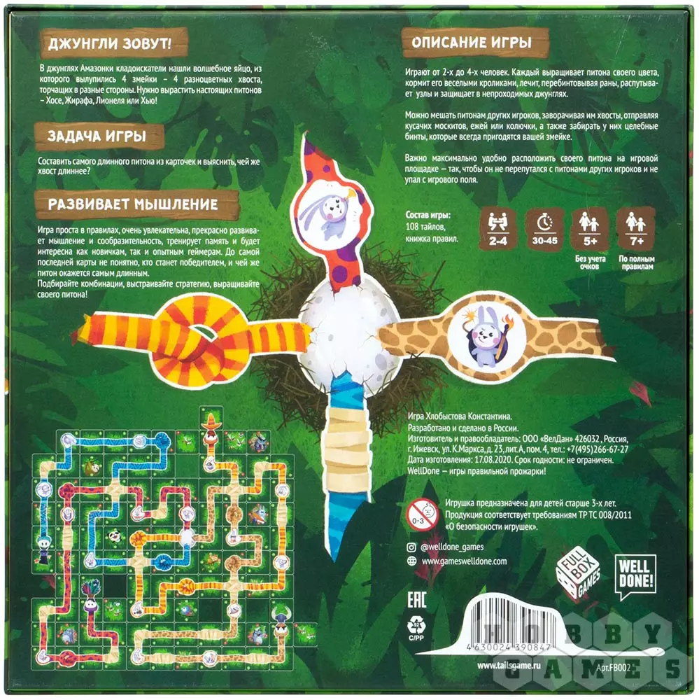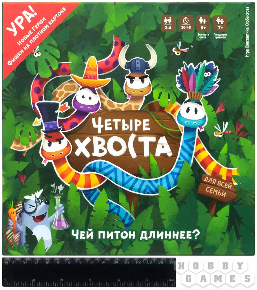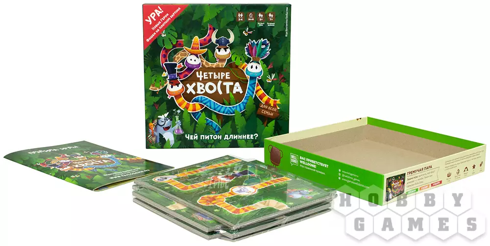 Задиристый Хью, весёлый Хосе, воинственный Жираф и добродушный Лионель – настоящие питоны, которые вылупились из волшебного яйца, найденного кладоискателями в джунглях Амазонки. В весёлой настольной игре "Четыре Хвоста" вам предстоит вырастить этих братьев до максимального размера.