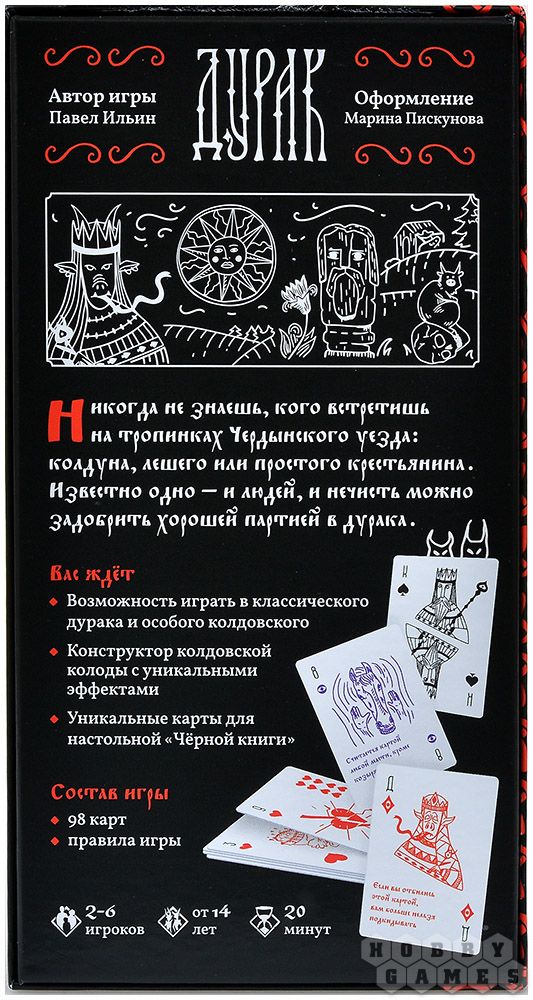 "Чёрная книга: Дурак" – это уникальная колдовская карточная игра, где классический дурак переплетается с магией. Освойте правила переводного дурака и откройте для себя заколдованные нечистью карты с их магическими эффектами. Ваши руки развязаны – выбирайте, как и с кем играть, но никогда не забывайте: как бы ни были плохи дела, а душой рисковать не стоит! Вас ждут уникальные возможности: конструирование колдовской колоды с особыми эффектами и возможность сыграть в особый колдовской вариант классического дурака. Станьте мастером карточных игр, но будьте осторожны – на этих тропинках не всё так просто!