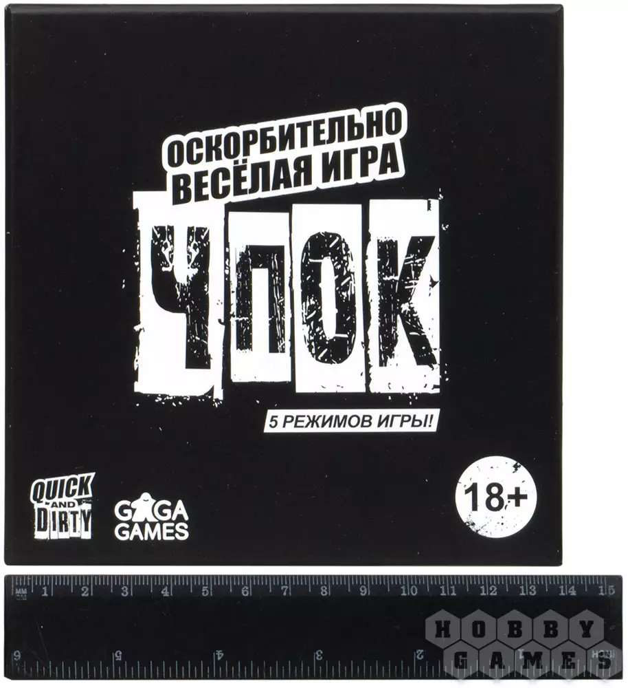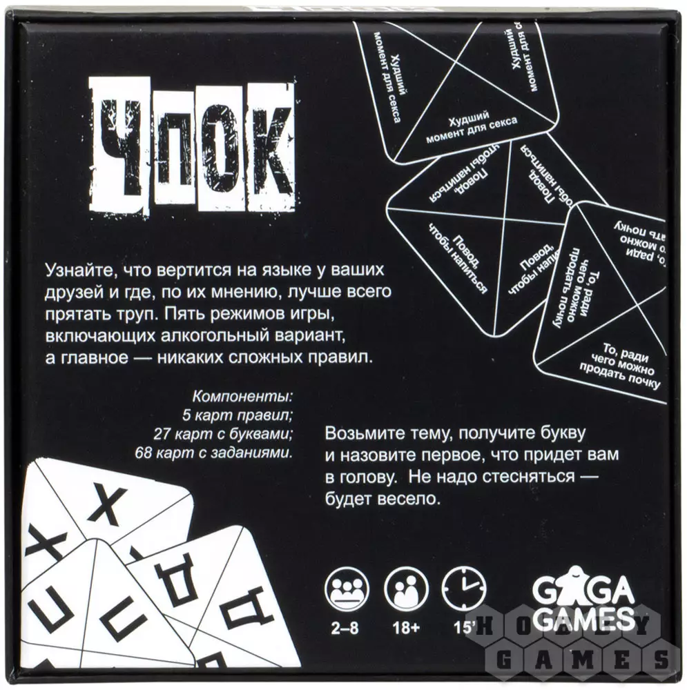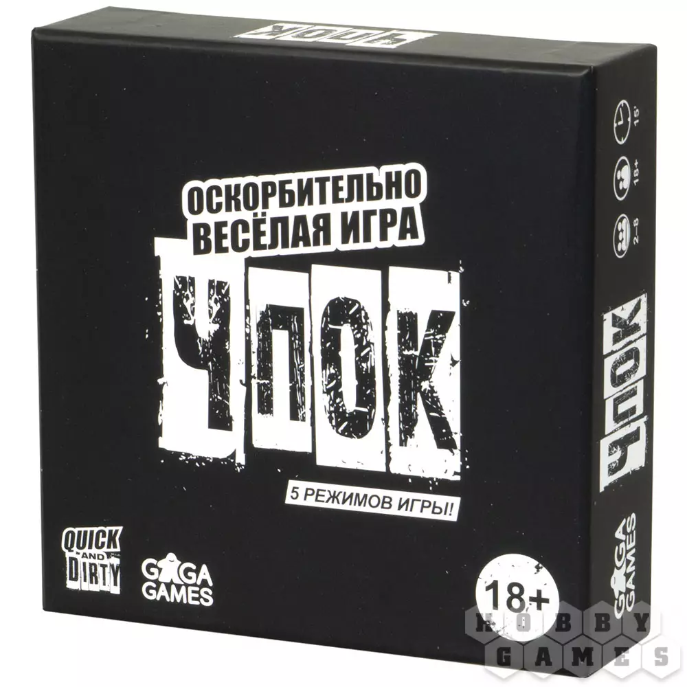 "Чпок" – это адский коктейль из жёстких шуток, вопиющего бесстыдства и развратных тем. Если слишком увлечётесь, то припоминать особенно удачные перлы вам будут ещё долго – а уровень общей вовлечённости легко (но не обязательно) увеличить при помощи крепких напитков. По ходу игры нужно придумывать слова на заданные игрой темы, а они невероятно пошлые и мерзкие, как на подбор. В игре целых пять режимов – и у каждого есть вариации с выпивкой и без, а 68 заданий и 27 карт с буквами составляют огромное количество комбинаций – и море веселья. А самое приятное – это правила, которые настолько простые, что для них даже не понадобился отдельный буклет, ведь всё влезло на несколько карточек. Просто забудьте про стыд и совесть и наслаждайтесь сложившейся ситуацией!