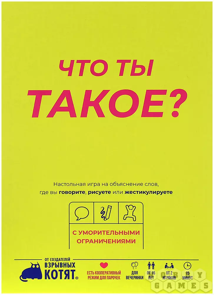 "Что ты такое?" могла стать очередной игрой на объяснение слов разными способами, при взгляде на которую в голове появлялся бы вопрос, украшающий коробку. Но она не стала! А всё благодаря своей изюминке – забавным ограничениям, превращающим игровой процесс в театр абсурда и нескончаемой уморы. Вот представьте: вы вытянули карту задания, а она говорит вам объясняться рисунком, НО В ПРОЦЕССЕ ВАША ГОЛОВА ДОЛЖНА ЛЕЖАТЬ НА СТОЛЕ. Или вы должны объяснить слово жестами, НО В ЭТО ВРЕМЯ ВЫ ОБЯЗАНЫ КРУЖИТЬСЯ ВОКРУГ СЕБЯ ВСЁ ВРЕМЯ. Звучит безумно, не правда ли? А выглядит ещё безумнее и смешнее, отчего в голове и возникает тот самый вопрос: да что же ты такое?