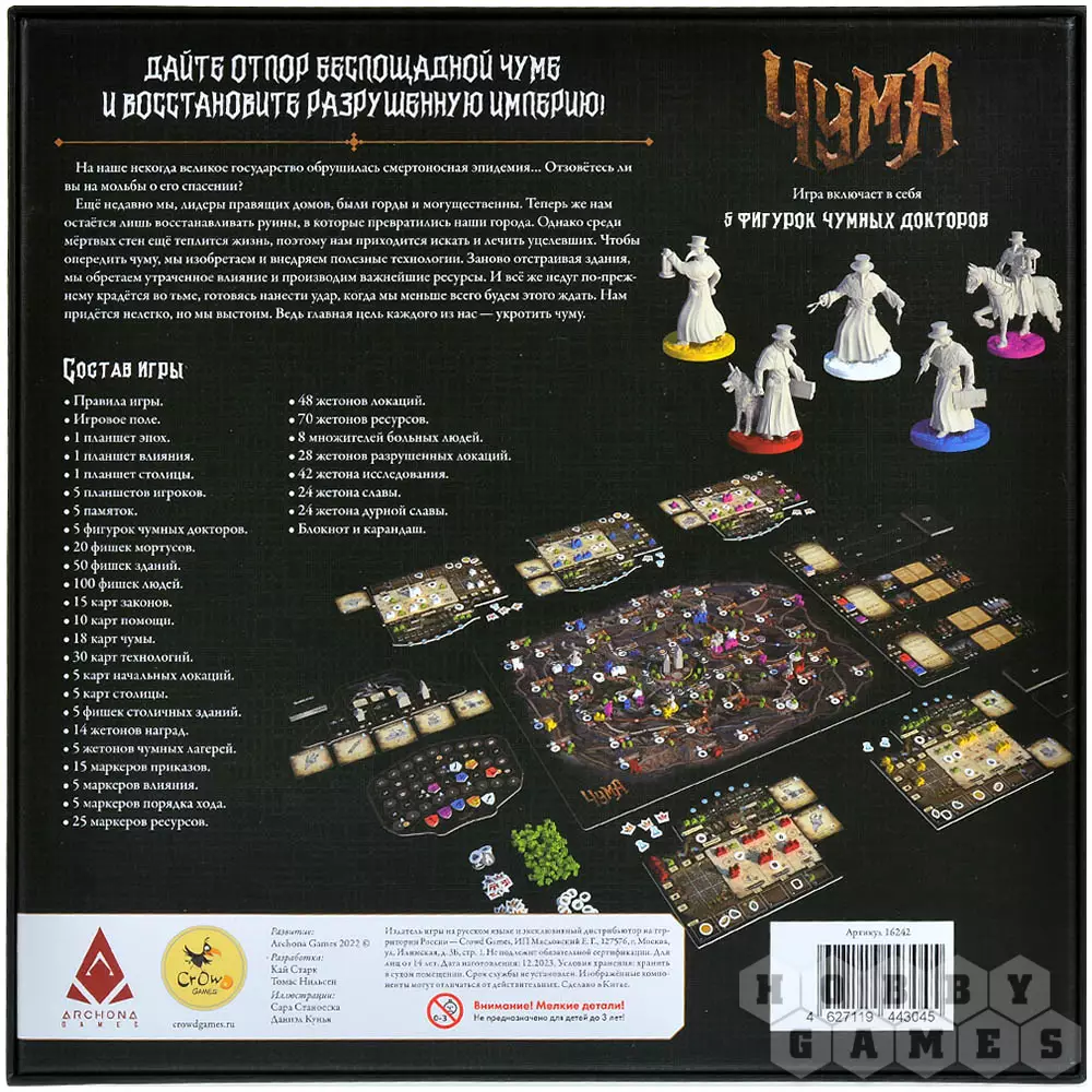 "Чума" – это атмосферная кооперативная настольная игра, в которой вы отправляетесь в охваченный бедствием город, чтобы спасти его от надвигающейся гибели. Игроки управляют персонажами с уникальными способностями, исследуют локации, ищут улики и сталкиваются с ужасами, подтачивающими не только тела, но и волю. Механика игры построена на сценариях с нелинейным развитием, где каждое ваше действие влияет на то, каким будет финал.