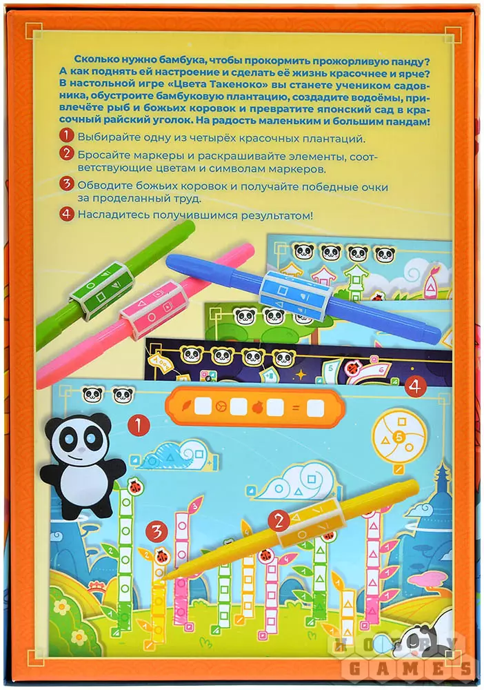 Перед вами настольная ролл-н-райт игра. В лучших традициях жанра вы будете полагаться на жребий судьбы и бросать не кубики, но маркеры с надетыми на них кольцами с изображением символов. Получив комбинацию цвета и символа, вы должны будете раскрасить на своём листе подходящий элемент. Ваша цель – как можно быстрее собрать трёх божьих коровок. Сделать это можно, закрасив область, рядом с которой они расположены: рыбку, бамбук, облачко или даже целого дракона. Это простая, но увлекательная игра, которая идеально подойдёт для семейного досуга и понравится детям.