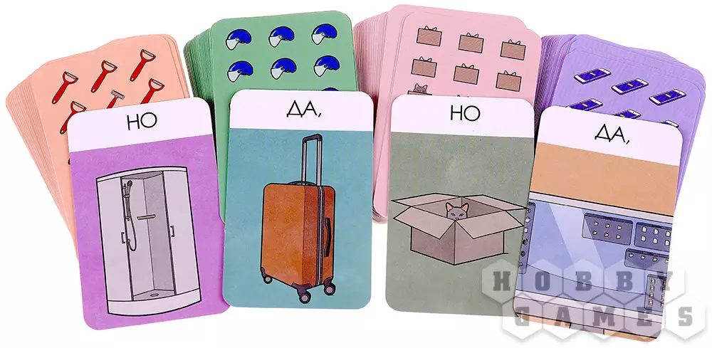 В "Да, но это другое" четыре тематических колоды, каждая по 28 карт. В начале каждого раунда вам нужно определиться с тем, какую колоду вы будете сейчас раскладывать. Сделав выбор, перемешайте её и раздайте каждому игроку по 2 карты изнанкой вверх, то есть вслепую. Оставшаяся часть колоды отправляется в центр стола. Полученные карты менять местами нельзя! Запомните: выкладывать – самую левую карту, добавлять – только справа.