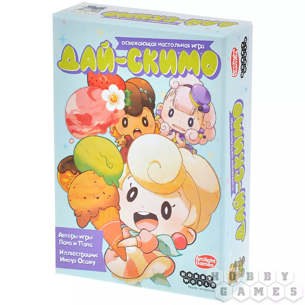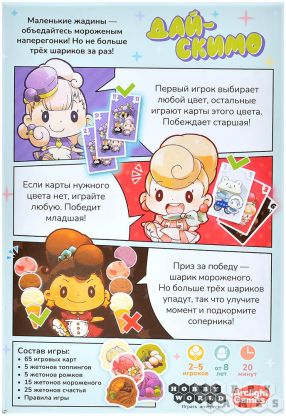 "Дай-скимо" – это динамичная карточная игра, где вы будете собирать на свой вафельный рожок аппетитные шарики мороженого самых разных вкусов и цветов. Эта настолка не заставит вас скучать – правила осваиваются за минуту, а партия пролетает весело и динамично. Красочные иллюстрации от японского иллюстратора, милые жетоны мороженого и простая механика делают её идеальным выбором для семейного досуга, встречи с друзьями или даже игры в путешествии.