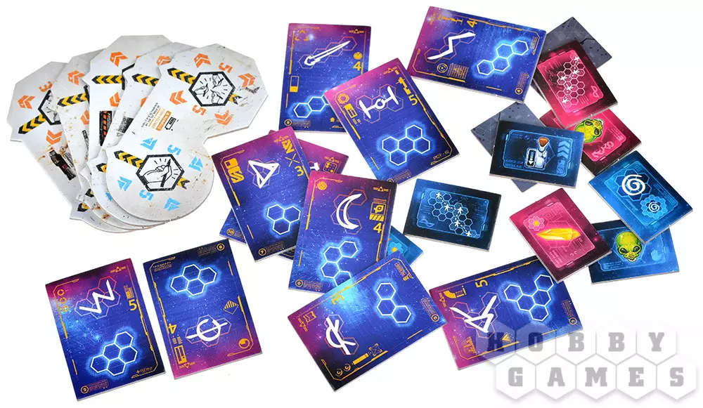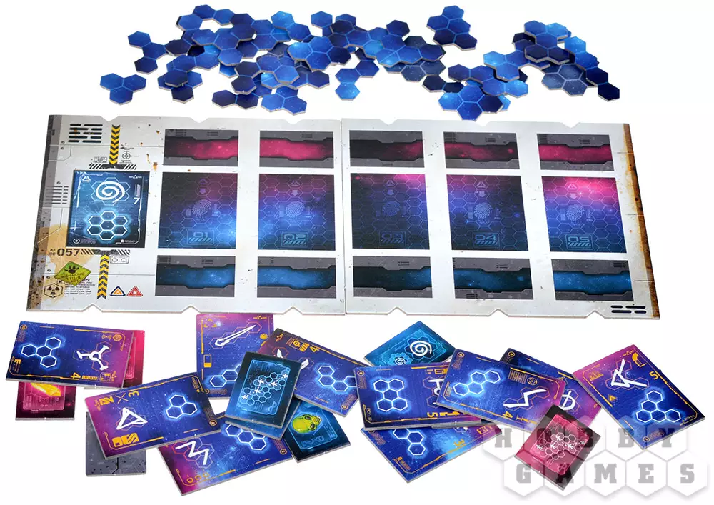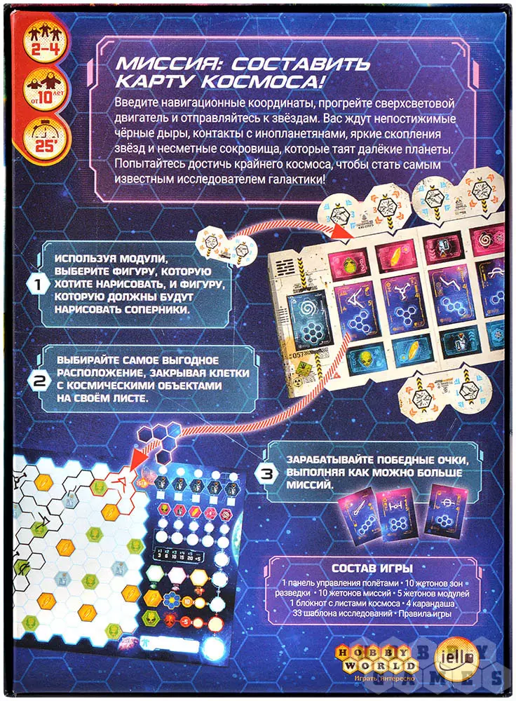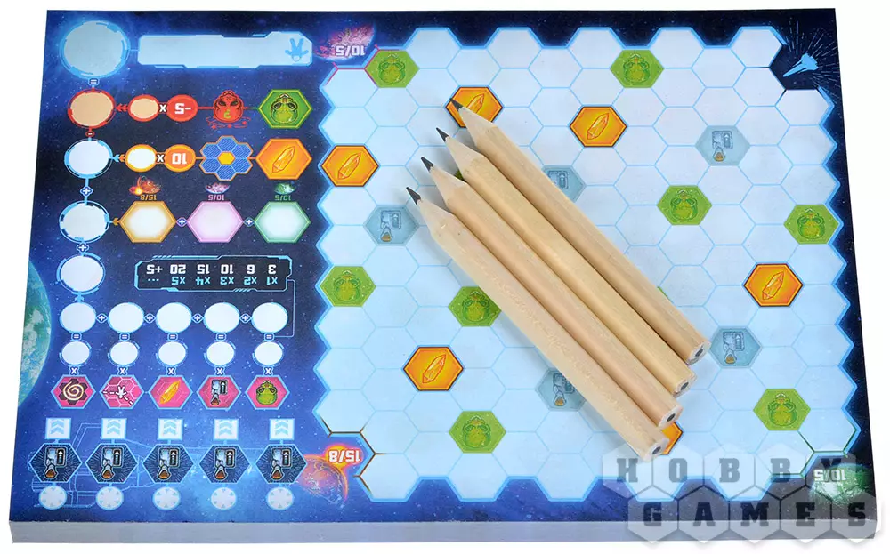 Каждый исследователь будет рисовать карту на своём листе космоса, а определять маршрут с помощью модулей и панели управления полётом. Модули состоят из восьмиугольника и круга: символ на восьмиугольнике указывает на соперников, а символ на круге – на вас. Модуль управления полётом содержит 10 жетонов зон разведки, по 5 с двух сторон, на них изображены фигуры, которые исследователи будут рисовать на карте. Каждый раунд состоит из фаз распределение и рисование. В первой фазе активный игрок берёт верхний модуль из стопки модулей и устанавливает его на любой стороне панели управления полётом напротив двух любых жетонов зон разведки. Если помните, символ на круглой части модуля указывает на активного игрока, поэтому он рисует фигуру напротив круглой части модуля, а все остальные – фигуру напротив восьмиугольной. Каждая следующая фигура должна закрывать хотя бы одну клетку, смежную с ранее нарисованной фигурой: их можно вращать и отражать зеркально. Главное – нарисовать фигуру полностью. Когда игрок не может разместить новый модуль, или они закончились, раунд заканчивается. Соберите модули обратно в стопку и начните новый раунд.
