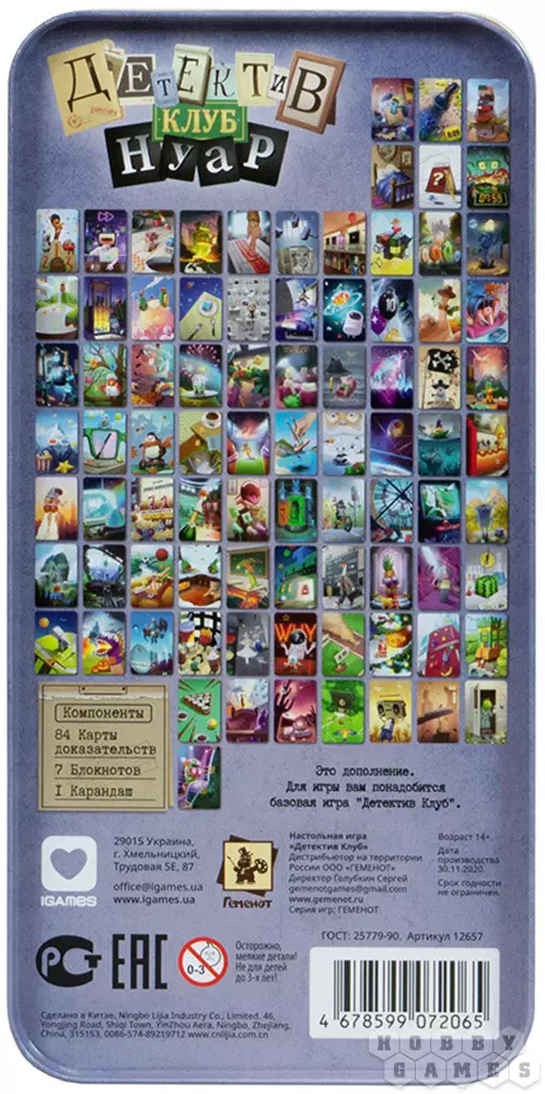 "Детектив Клуб: Нуар" – это дополнительные 84 карты для настольной игры "Детектив Клуб". Новые карты доказательств помогут вам ещё лучше зашифровывать свои "ключи" и вычислять конспиратора. Иллюстрации на картах, конечно, не такие нуарные, как могут показаться и как гласит название дополнения, но вариантов для загадывания "мрачных" шифров более чем предостаточно!