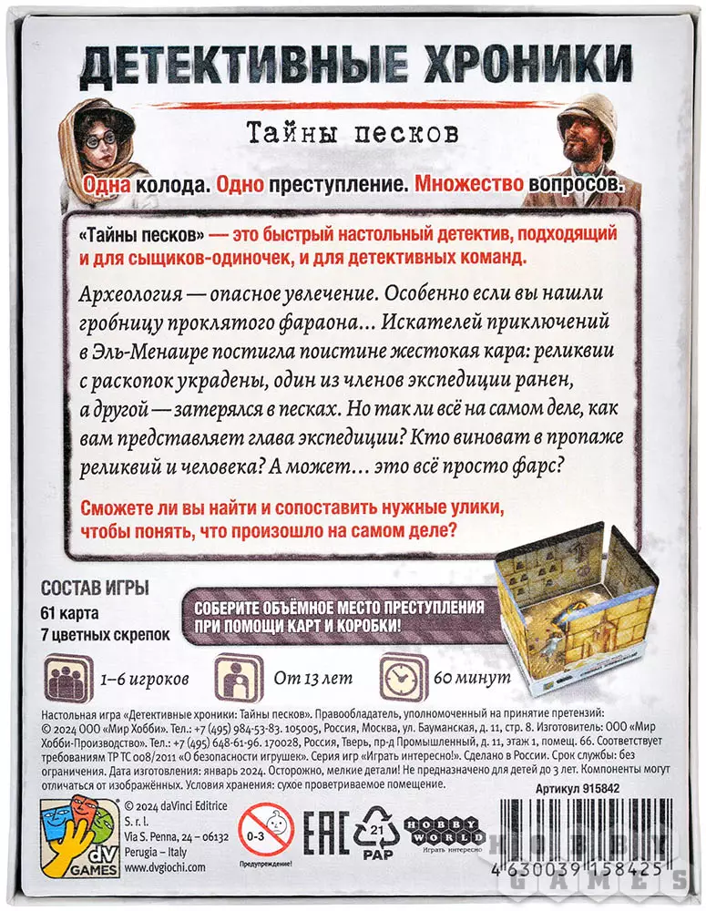 "Детективные хроники: Тайны песков" – это игра о совместном расследовании, в которой рассказывается о произошедшем преступлении. Игроки должны сообща раскрыть загадочный случай. Они разыгрывают свои карты, чтобы делиться информацией, сбрасывают карты, которые, по их мнению, приведут их в неправильное русло, обсуждают найденные улики, делают гипотезы и выводы, чтобы найти решение!