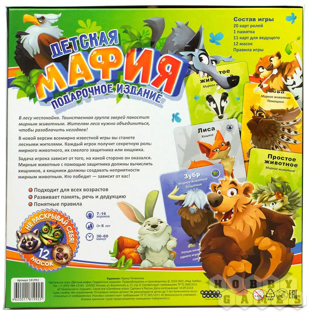 "Детская Мафия" представляет собой адаптированный для детей вариант классической и всемирно известной психологической игры. Но пусть вас нисколько не смущает её "детскость" – игра не подверглась никаким упрощениям, а даже наоборот, дополнилась интересными правилами и нововведениями. Единственное значимое отличие от взрослой версии заключается в адаптированном дизайне и в том, что все действия происходят не в городе, а в лесу; вместо мафии и мирных жителей у нас теперь соответственно хищники и мирные животные. Также в игре присутствует медведь-ведущий, который следит за игрой, но не принимает в ней непосредственное участие.