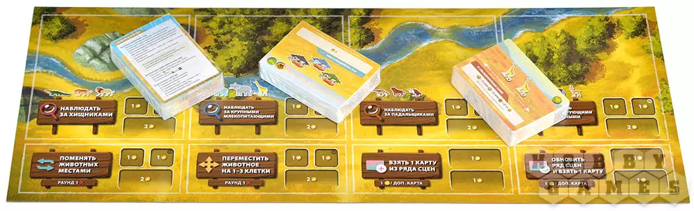 В настольной игре "Дикая природа Серенгети" вам предстоит стать режиссёром фильма о природе заповедника. Цель игры – заработать больше других очков престижа, снимая удачные сцены с животными. У вас будут карты этих самых сцен с положениями животных, при которых эта она может быть снята. В свой ход можно выставить на игровое поле новое животное, или переместить уже находящееся на нём. Однако добиться идеального кадра непросто: некоторые животные опасаются других, а какие-то и вовсе предпочитают конкретные места заповедника. Более того, каждый раунд будет происходить миграция животных, которая изменит их положение или вовсе уберёт с игрового поля. Старайтесь учитывать все факты и принимайте во внимание законы дикой природы, чтобы выставить удачный ракурс, снять как можно больше сцен и добиться признание мирового сообщества!