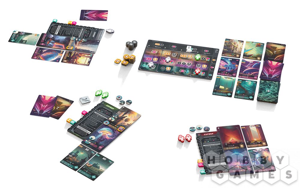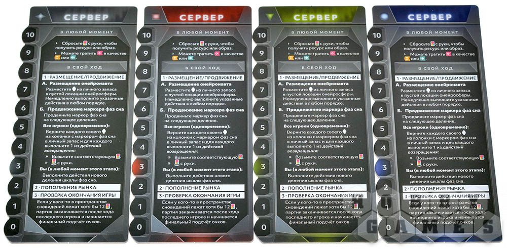 В центре стола располагается планшет онейросферы с треком фаз сна, а также карты снов, разделённые на 3 колоды по видам: осознанные, коллективные и повторяющиеся. Игроки получают личные компоненты: планшеты сервера и снов, фишки онейронавтов, маркеры ресурсов, жетоны образов и по одной карте сна каждого вида. Теперь всё готово, чтобы ваша корпорация начала работу!