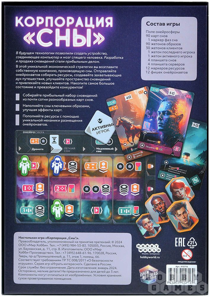 Чтобы создать прибыльное сновидение, вам потребуются ресурсы, а для их получения вы будете размещать на поле особых специалистов – онейронавтов. За это действие в игре отвечает уникальная механика. Всё зависит от ваших планов и доступных карт на рынке. В каждой партии вам предстоит заново придумать хитрый рабочий механизм, чтобы победить. Ресурсы же требуются для розыгрыша карт снов, с помощью которых вы и будете творить сладкие грёзы для клиентов компании. А чтобы эффект снов становился сильнее и круче, старайтесь заполнять их ключевыми образами. Привлекайте новую аудиторию, копите состояние и покажите конкурентам, кто на этом рынке настоящий профессионал. Сон в руку!