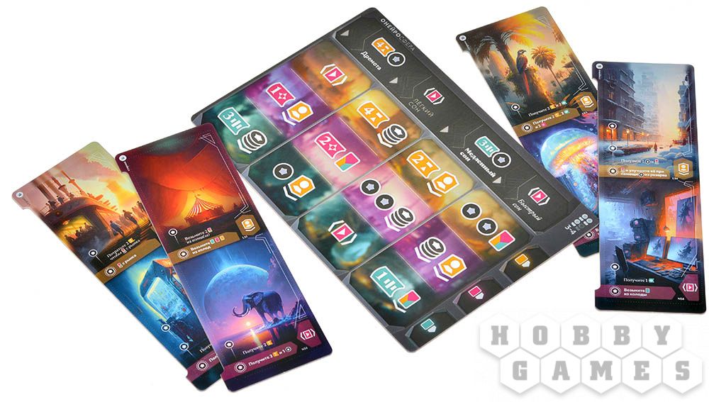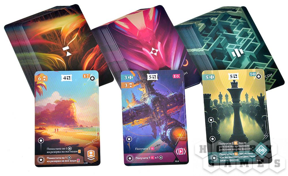 В зависимости от занятой онейронавтом клетки, вы можете получить ресурсы, жетон образа или карту с рынка, разыграть карту, разместить образы на карты снов, а также активировать свойства сыгранных ранее карт.