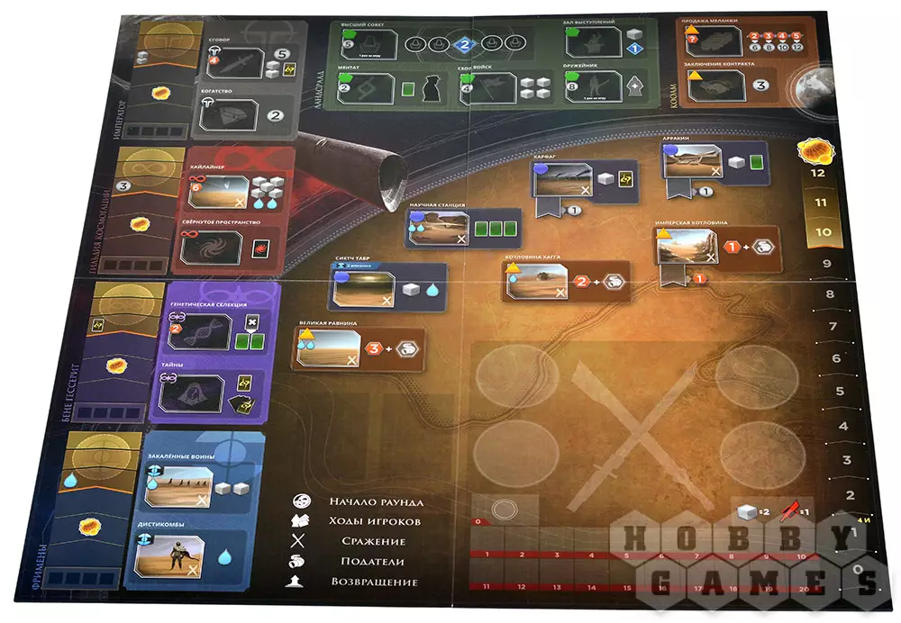 У каждого игрока своя неповторимая колода карт, используя которую контролируются события Дома. Карты символизируют различные предметы и героев, ситуации, оказывающие влияние на борьбу за Пряность. Игроки сами вершат судьбу своего Дома и историю, при помощи уникальных способностей и талантов. Игра состоит из 10 раундов, и завершается, когда один из претендентов на трон получает 10 победных очков. Захватите территории и станьте главным на этой пустынной планете!