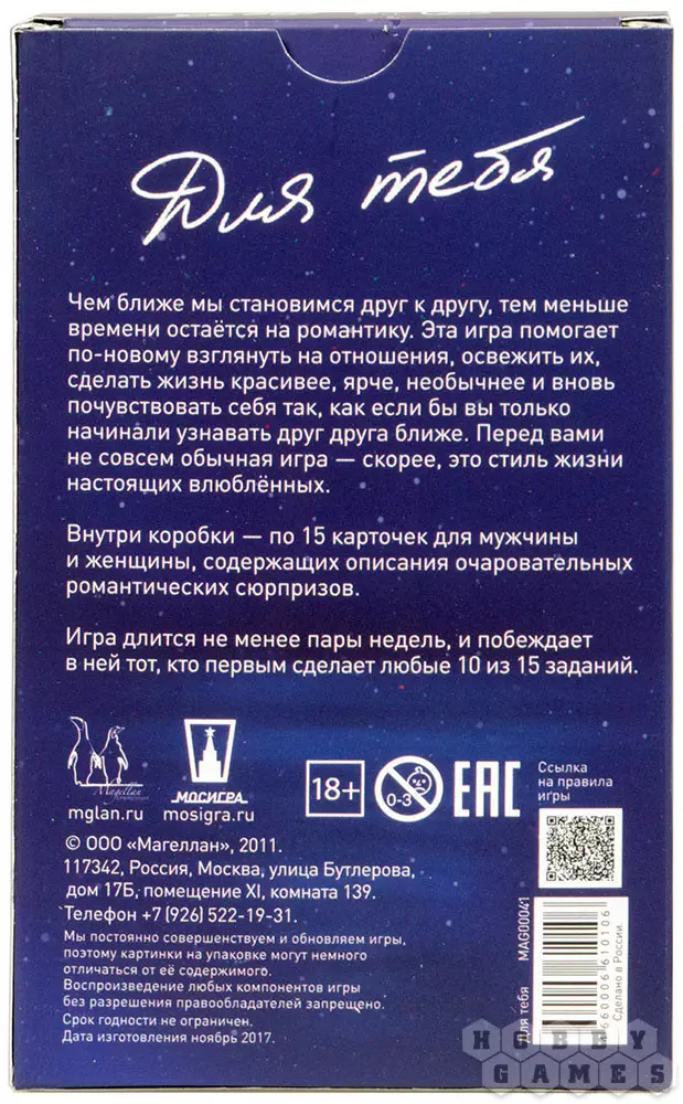 Внутри коробочки содержатся два конверта романтических заданий – для него и для неё, а также гибкий магнит на холодильник, где будет вестись счёт выполненных сюрпризов. Это приключение продлится довольно долго, а победителем станет тот, кто первым организует десять романтических мероприятий. Хотя, по большому счёту, это будет уже неважно, поскольку ваши отношения получат новый виток развития, вы, несомненно, станете ещё ближе друг к другу, получив незабываемые впечатления.