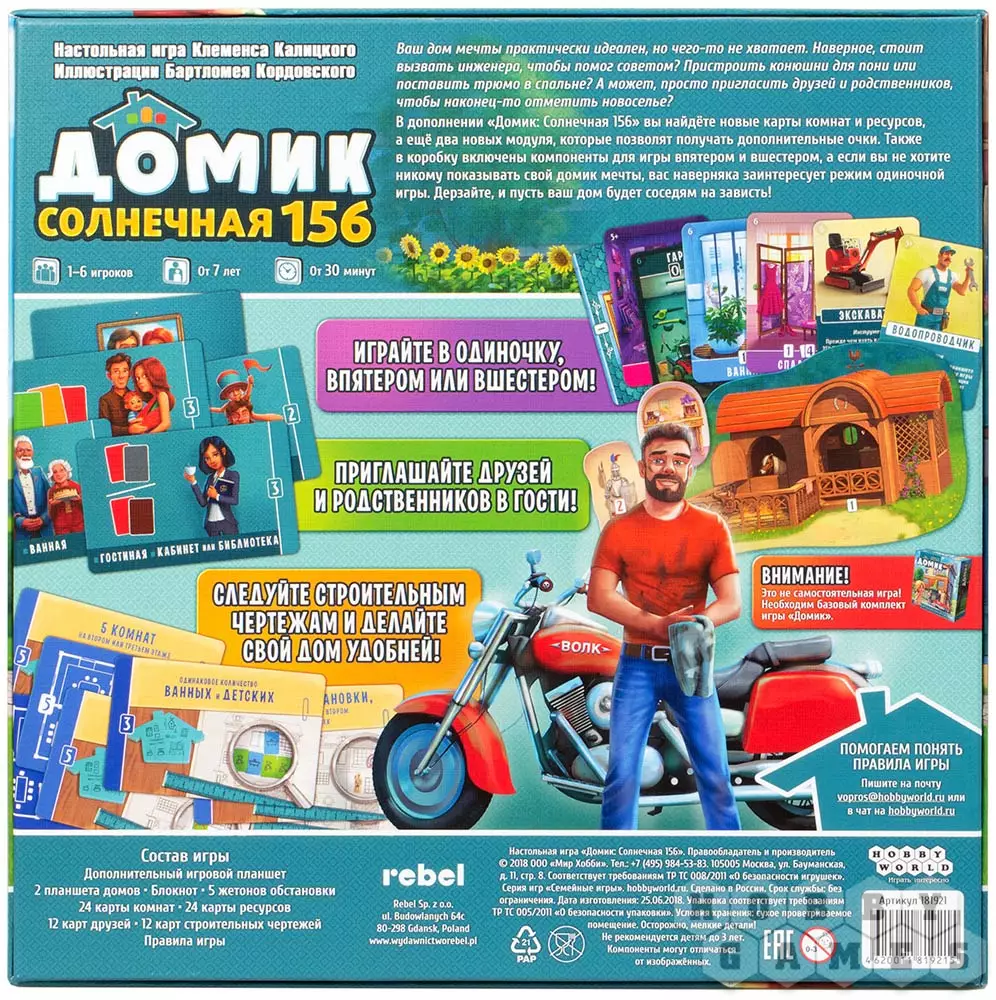 "Домик. Солнечная 156" – это дополнение для милой и уютной настольной игры, в котором игроки занимаются проектированием домиков своей мечты, а также их интерьером. Дополнение привносит много нового и интересного, позволяет играть большим количеством человек, добавляет новые карты и т. д.
