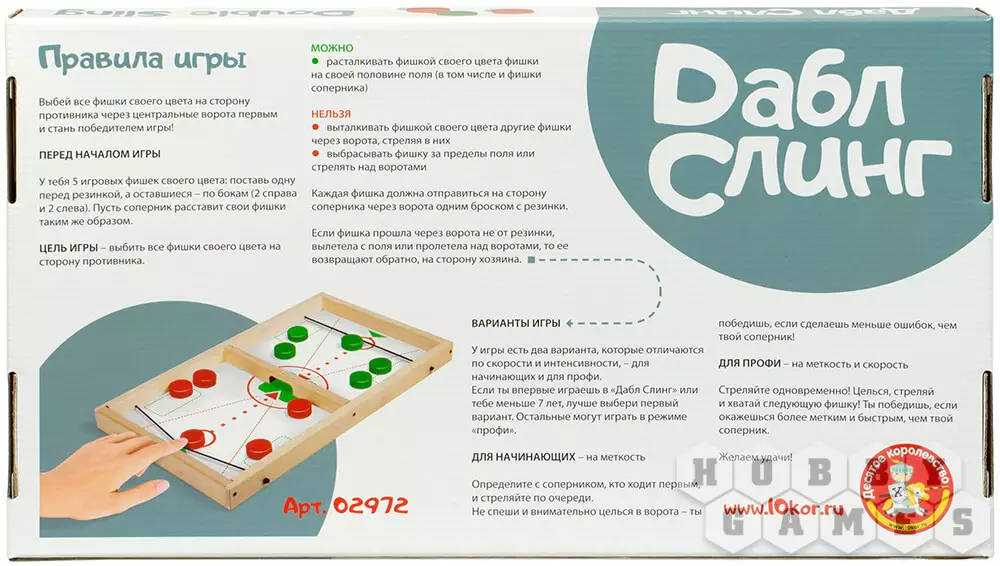 Double Sling – это состязательная спортивная игра, которая придётся по вкусу как совсем малышам, так и игрокам постарше. Суть игры в том, чтобы выбить все фишки своего цвета на сторону противника, используя для этого специальную резинку. Неопытные игроки ходят по очереди, а более искушённые могут стрелять фишками и одновременно. Double Sling не только помогает весело провести время, но и тренирует мелкую моторику рук, чему очень важно уделять внимание в юном возрасте.