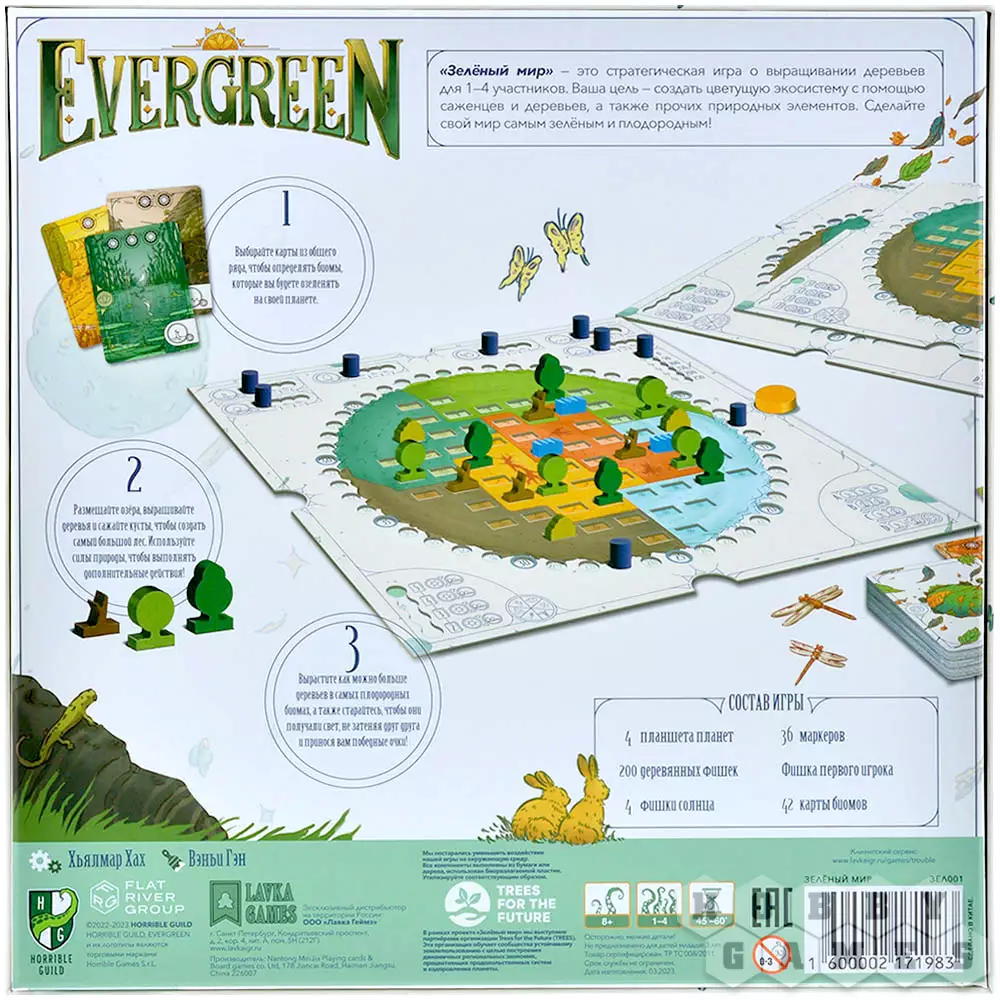 Добро пожаловать в удивительный мир Evergreen, где каждый из игроков стремится к процветанию своей планеты. Каждый новый раунд вам предлагается выбрать карту биома, которая определит, где вы разместите саженцы и превратите их в могучие деревья. Кроме того, выбранная карта дает вам возможность улучшить ландшафт вашей планеты.
