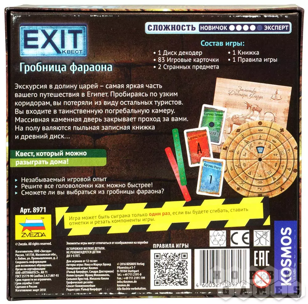 В "EXIT-Квест: Гробница Фараона" игрокам необходимо собраться с духом и на полную катушку использовать креативность и дедукцию. Вам предстоит взламывать шифры, разгадывать загадки, собирать разные предметы и всеми силами пробираться к выходу.