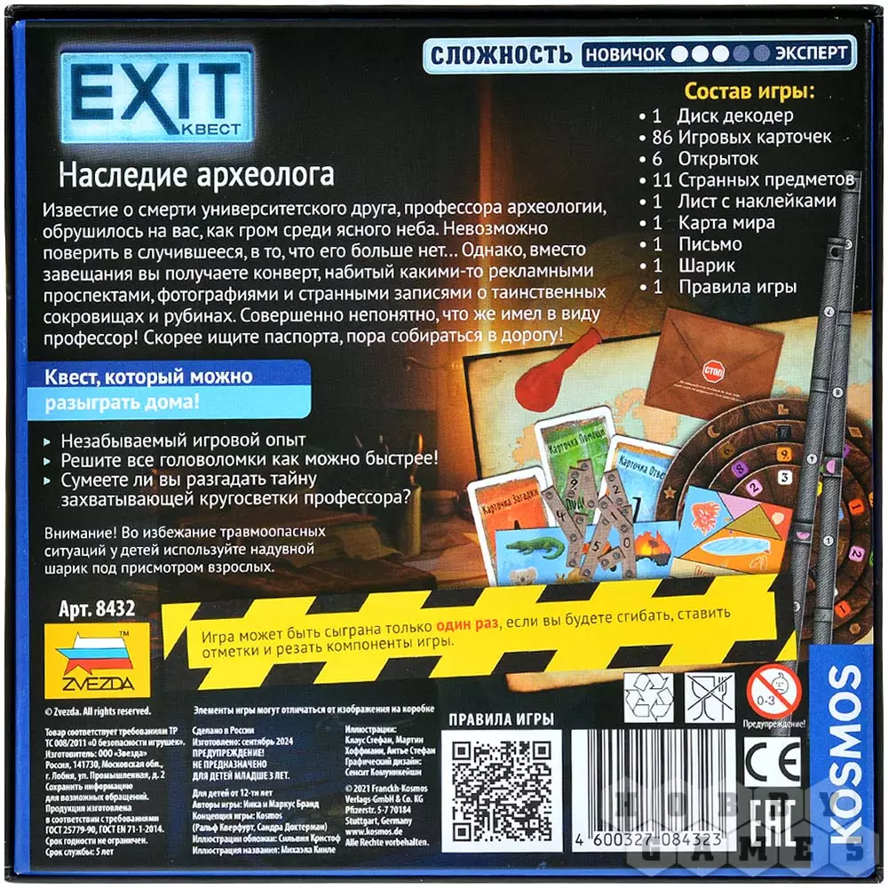 Серия "EXIT-Квестов" позволит вам, не выходя из дома, окунуться в мир квестов в реальности – невероятно популярного развлечения среди людей разных возрастов. А теперь поломать голову над задачкой, хорошенько при этом повеселившись, смогут и самые юные любители приключений и экстрима. Ваша задача – решить все загадки и успешно выбраться из квеста! Самое время приступать!