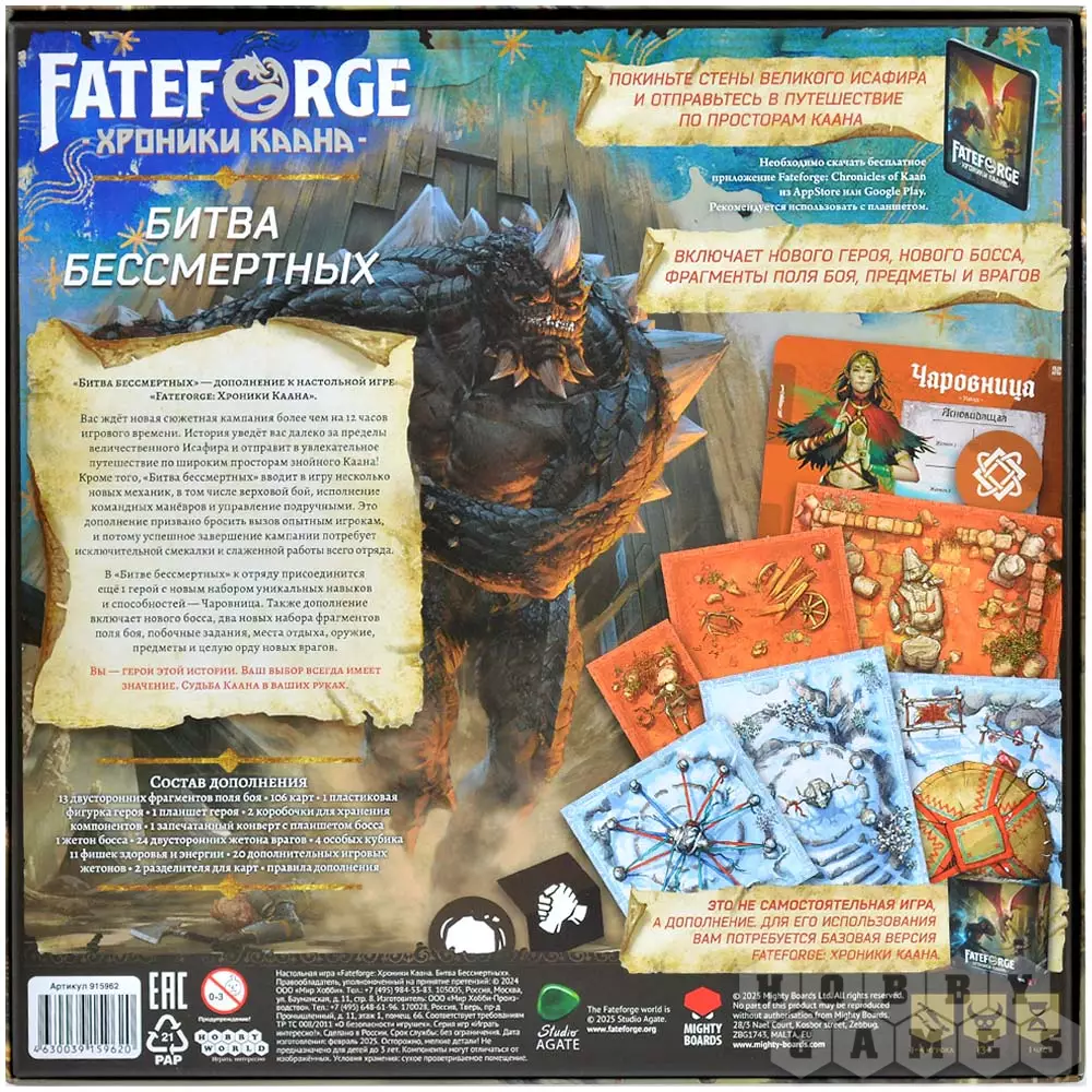 "Битва бессмертных" – это дополнение к игре "Fateforge: Хроники Каана", где вас ожидают новые механики, которые увеличат уровень сложности вашей кампании, но при этом доставят массу удовольствия. Теперь вы сможете сражаться верхом, управлять подручными и совершать совместные манёвры со своими союзниками. Также к вашему отряду присоединится новая спутница – загадочная Чаровница с уникальными способностями. Благодаря этому дополнению вы прочувствуете всю важность командной работы и слаженных, продуманных действий. Ведь именно они – гарант того, что вы сможете завершить это приключение и не погибнуть...