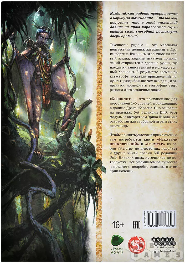 "Хронолит" – это приключение для серии "Fateforge: Летописи Эаны", рассчитанное на игроков с персонажами 1-5 уровня. Вам предстоит столкнуться с таинственным артефактом и исследовать долину Дракенбергена, окунувшись с головой в увлекательный мир Эаны. Напишите собственную историю, совершите уникальные открытия и отправьте своих героев по захватывающему пути приключений!