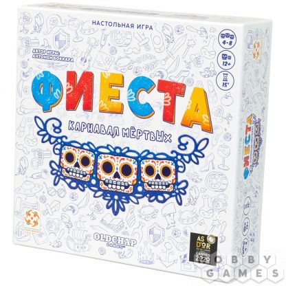 "Фиеста. Карнавал мёртвых" – это настольная игра для вечеринки, участники которой действуют заодно, используя как возникающие у них ассоциации, так и обычную логику. Игрокам предстоит отгадать знаменитых персонажей из истории, литературы, мифологии и не только по ассоциируемому им слову – но не по простой ассоциации, а по искажённой "испорченным телефоном". Игра рассчитана на компанию от 4 до 8 человек и сделает вашу вечеринку ещё веселее – а заодно поможет получше узнать друг друга.