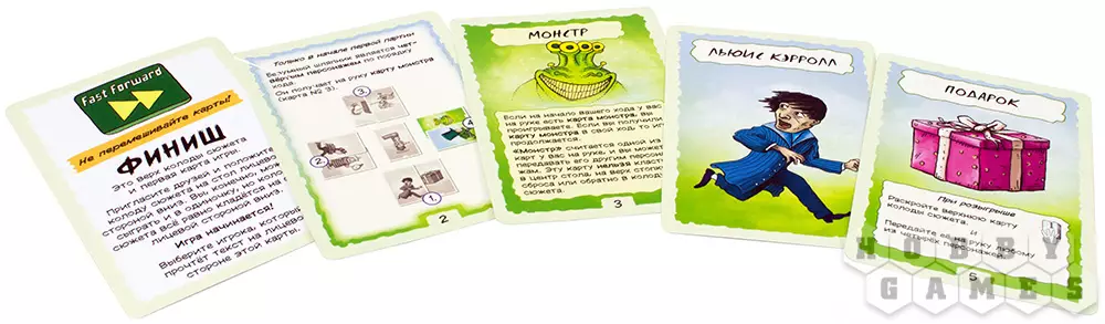 Если на начале хода игрока у него на руках есть карта монстра, то он проигрывает, однако, если он получает эту карту в свой ход, то действие продолжается. Коварную карту "Монстра" нужно передавать другому участнику, и ни в коем случае не сбрасывать её обратно в колоду. Смогут ли участники остаться живыми и прийти к финишу всех глав этой абсурдной истории – покажет случай.