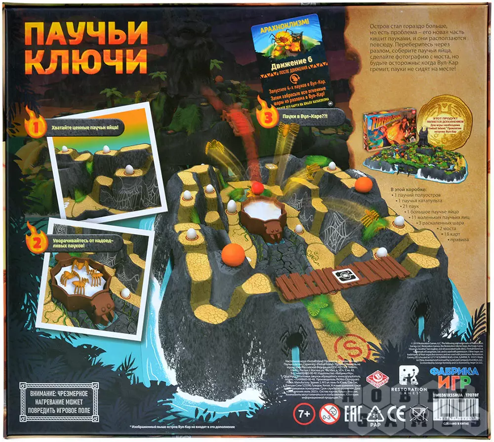 "Fireball Island: Паучьи Ключи" – это дополнение, которое привнесёт в вашу игру ещё больше приключений и непредсказуемости! Теперь ваш остров стал ещё больше и загадочнее, расширившись за счёт новых локаций и уникальных возможностей. Пройдя через таинственные пещеры, вы откроете для себя новые уголки острова, а может быть, и некоторые секреты его прошлого.