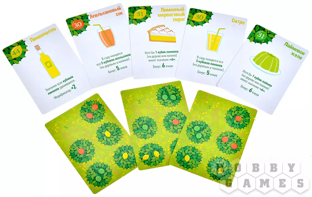 Помимо фруктовых деревьев на картах есть и пустые поляны, которыми можно накрывать фруктовые деревья, а это неплохой способ подготовить сад к новому участку! А ещё можно сыграть в режим с рецептами, которые изображены на обороте карт деревьев. При подготовке к игре просто отложите в сторону 2 карты рецепта, на них будут указаны условия получения бонусных очков, а сумма чисел в верхней части рецептов означает вашу цель в победных очках.