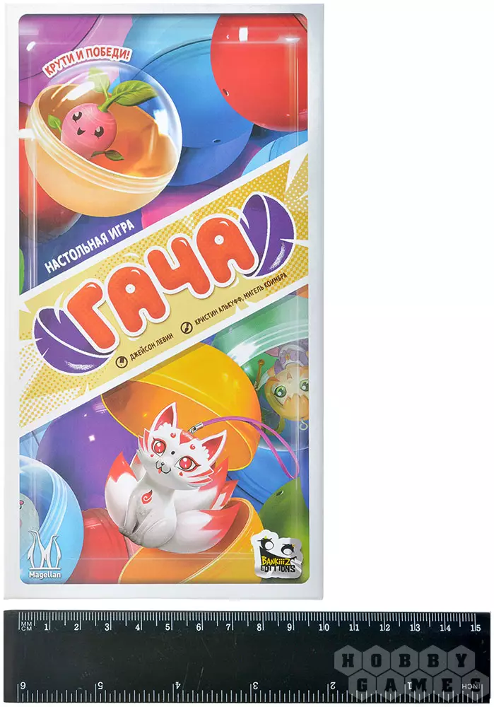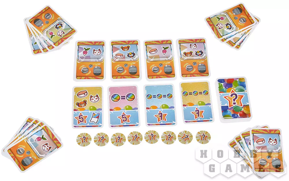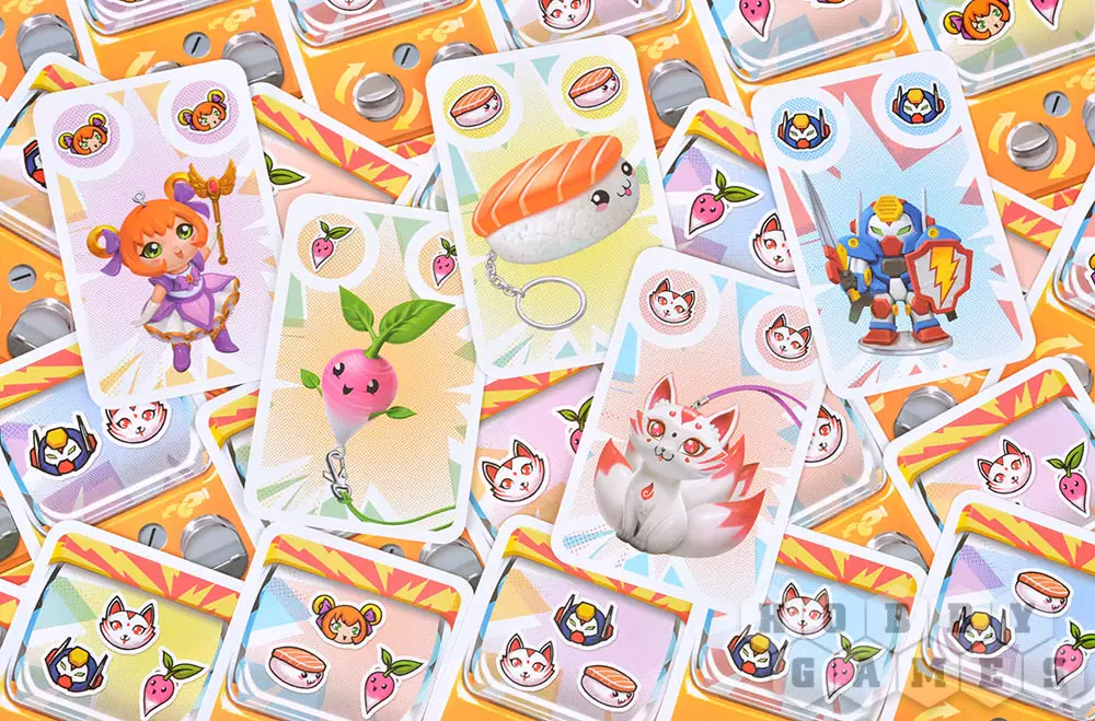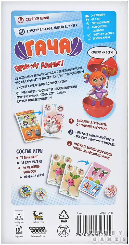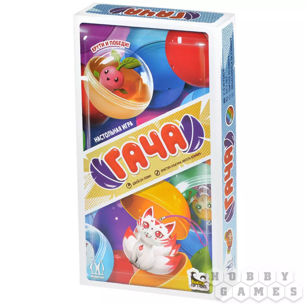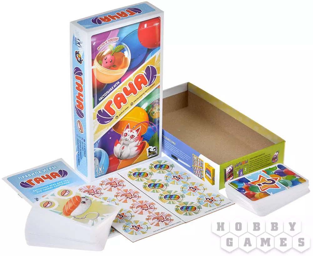 В настольной карточной игре "Гача" вы станете коллекционерами одноимённых игрушек! Какая фигурка вам достанется из аппарата: будет ли это трансформер или кицунэ? А может быть вам попадётся очень редкое позолоченное суши? Как бы то ни было, постарайтесь собрать наиболее ценную коллекцию фигурок и получите за неё наибольшее количество очков!