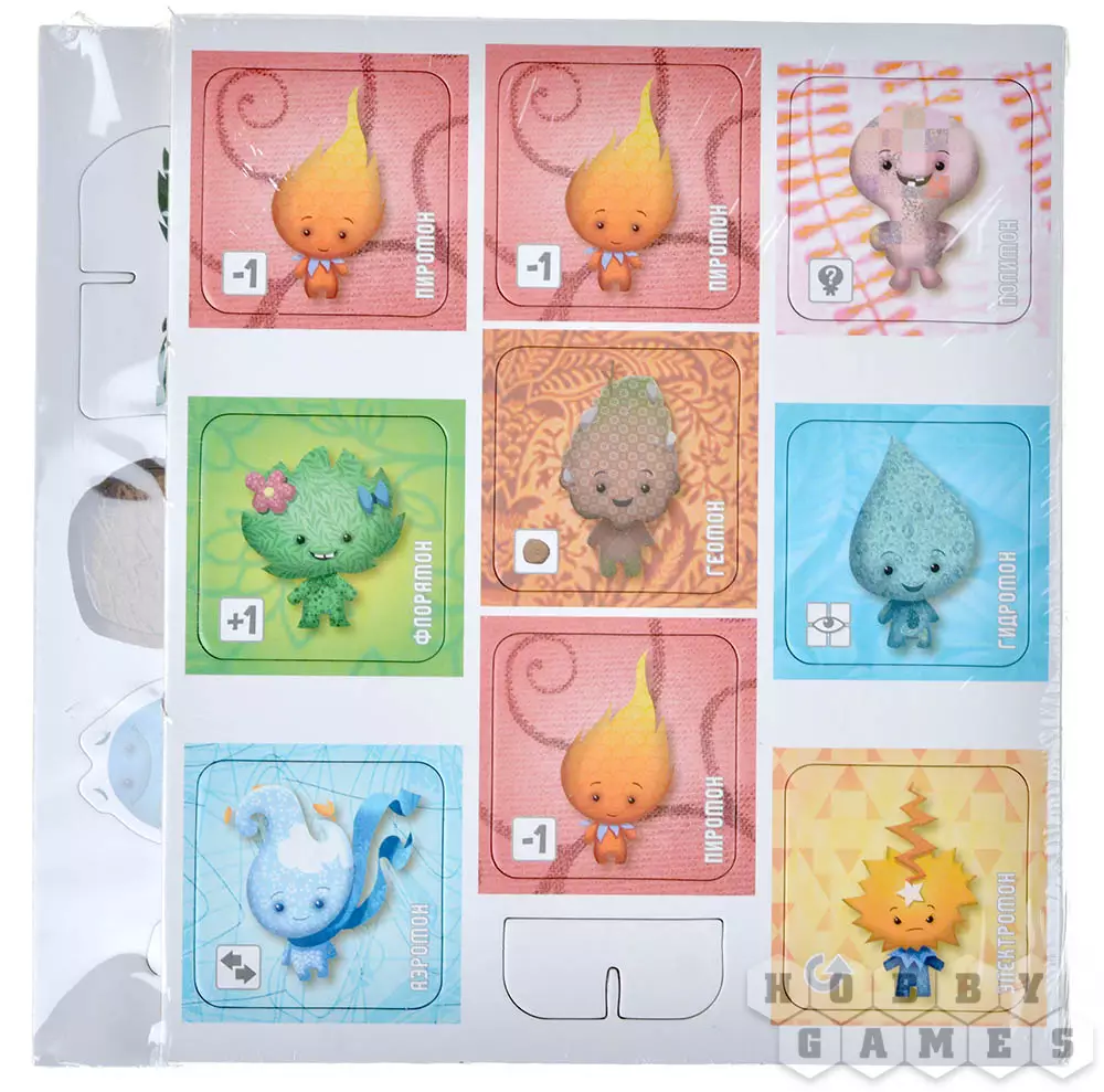 "Гигамон" – это простая и быстра игра на память. Выложите на столе поле 3x3 из тайлов элементов лицевой стороной вниз и начните игру! Игроки ходят по очереди, открывая по 2 любых тайла на столе. Если изображения на них совпали – заберите себе, а на их место выложите новые. Казалось бы, знакомая механика из игр типа мемори, но отличительной особенностью игры является возможность активировать особые способности собранных попарно Элемонов, которые будут давать вам некоторые преимущества. Как только вы соберёте три тайла с одинаковыми Элемонами, вы можете обменять их на Гигамона! Возьмите его из запаса или заберите у другого игрока.